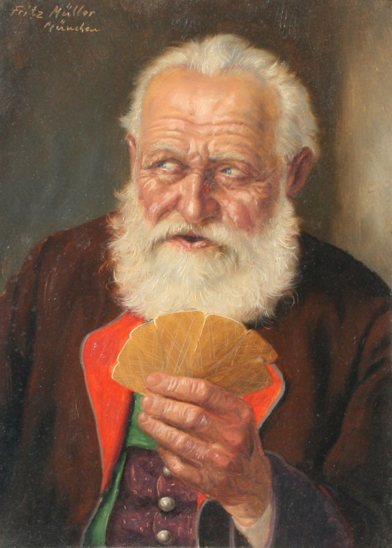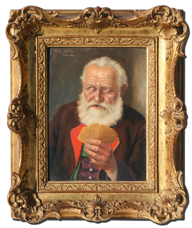 MULLER, Fritz, (German, 1867-1926): The Old Card Player, OIL/Masonite, 9 1/2'' x 7'', signed, marked Munchen, pierced carved and gilded frame, 14'' x 11 1/2''.