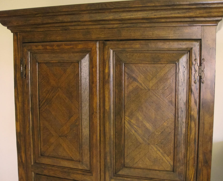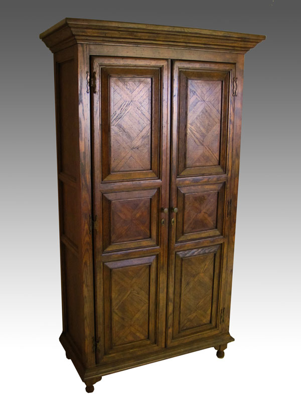 RAY SOBOTA FOR CENTURY FURNITURE ''COUNTRY CLASSIC'' ARMOIRE: Oak parquetry double door cabinet, shelved interior. Approx. 79''h. x 41'' x 21''. Provenance: Estate of Ray Sobota.