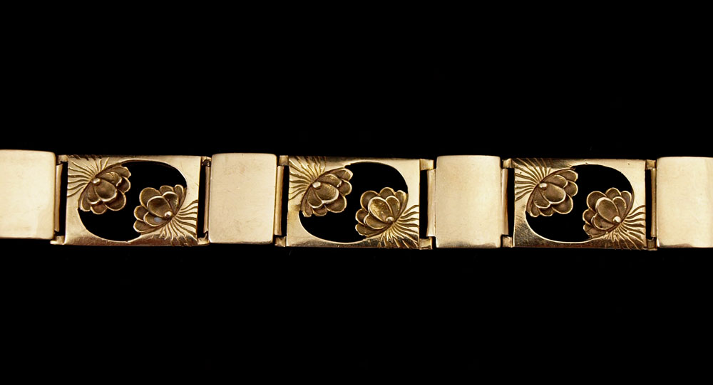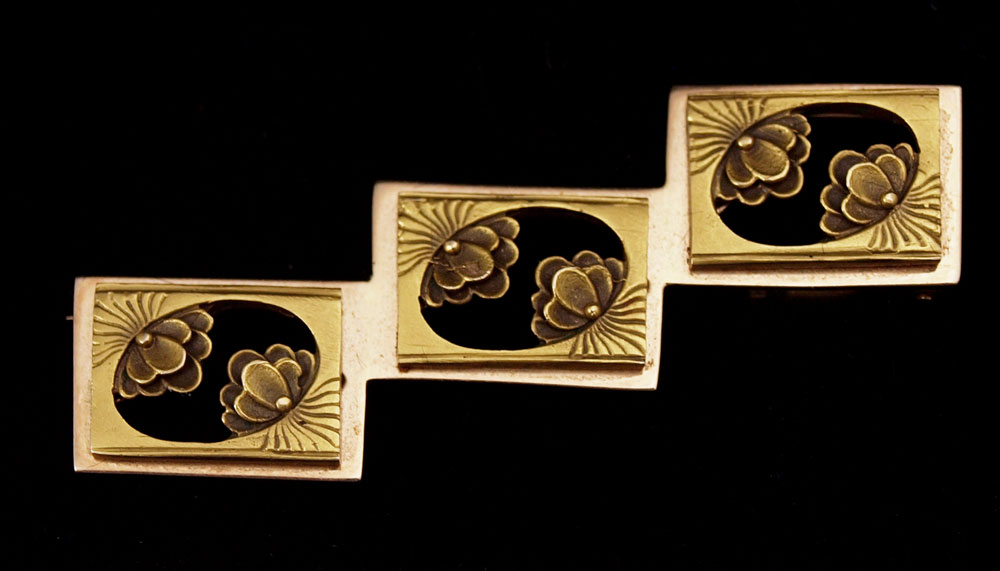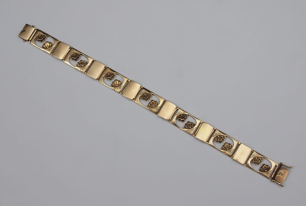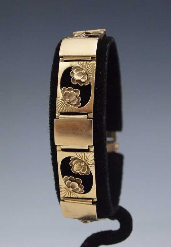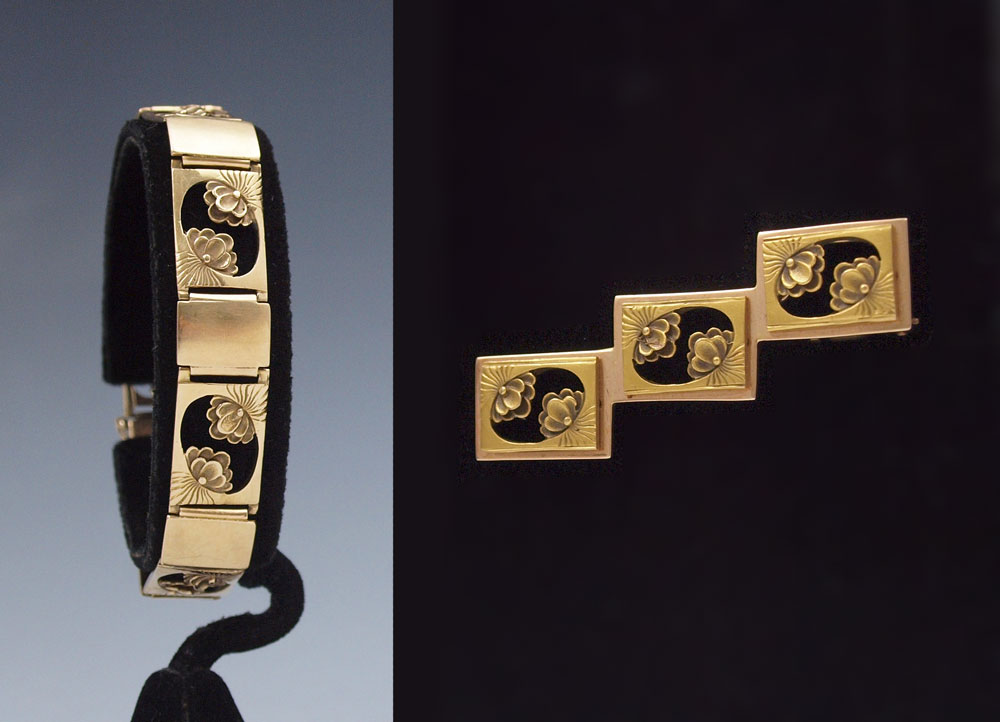 14K ART NOUVEAU BRACELET AND BROOCH SET: 14K yellow gold Art Nouveau bracelet and brooch. Floral cut work design. Bracelet is 7 1/2'' in length. Brooch is approx. 2 1/4'' in length. Weight: 32.9 grams.