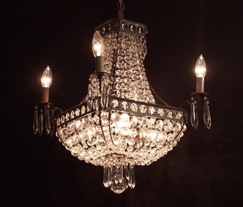 DIMINUTIVE FRENCH EMPIRE STYLE CRYSTAL CHANDELIER: 8 lights, 4 under the crystals, 4 out. Bronze ? frame. Approx. 20'' x 20''