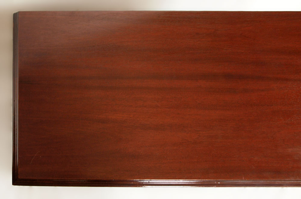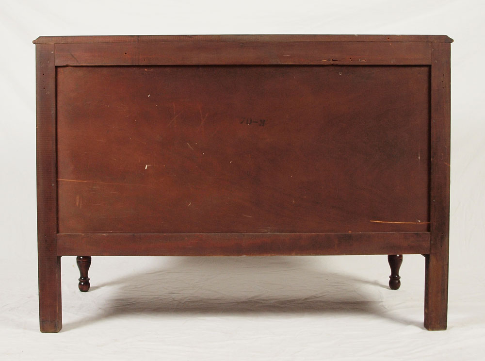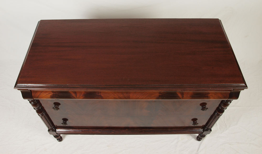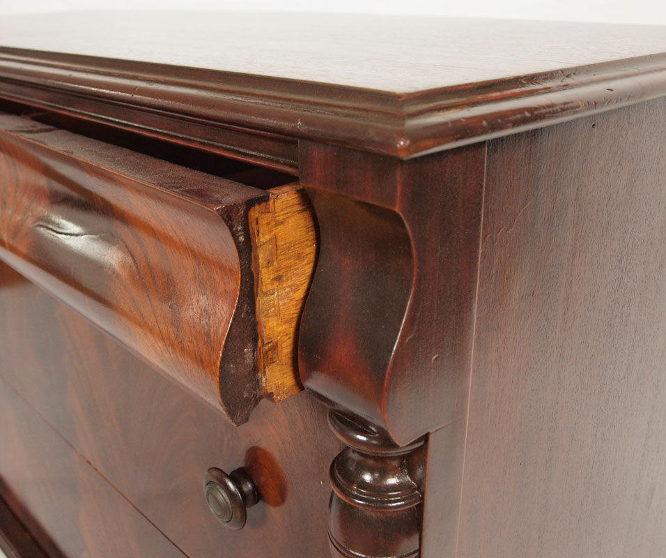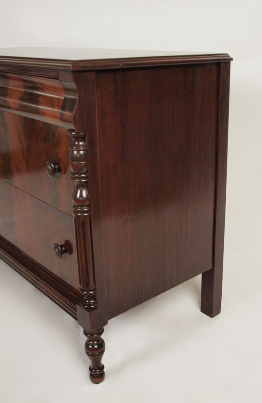 EARLY 1900'S FLAME GRAIN MAHOGANY VENEERED 3 DRAWER CHEST: Empire style three drawer dresser with half turned and fluted corners with turned legs, 34 1/2''h. x 48'' x 21''.