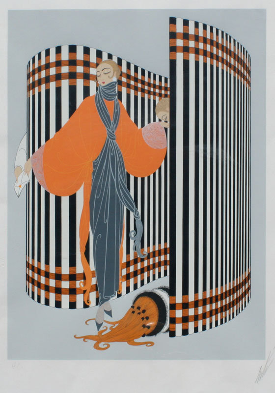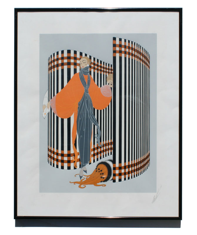 ERTE ''COCQUETTE'' SERIGRAPH: Woman in Orange, sight size 23 1/2'' x 18'', pencil signed, marked H.C., black metal frame, 24'' x 19''. All of these pieces bear the Circle Fine Art blind stamp in the left margin. Est. $400/600**