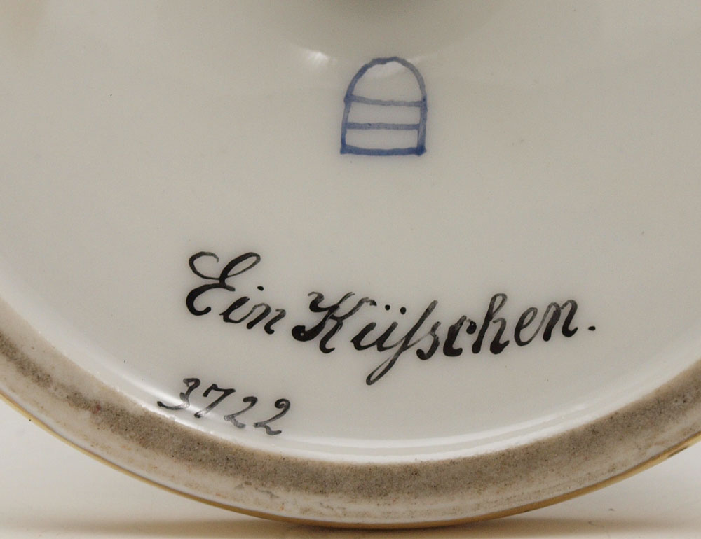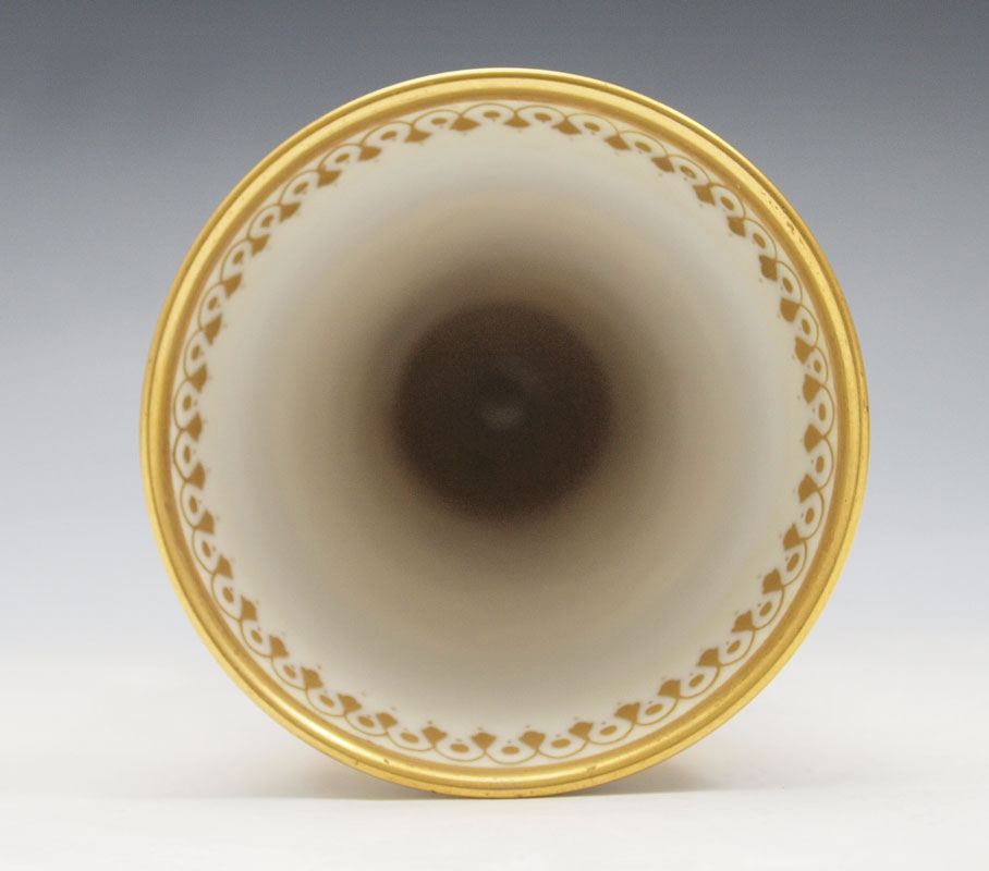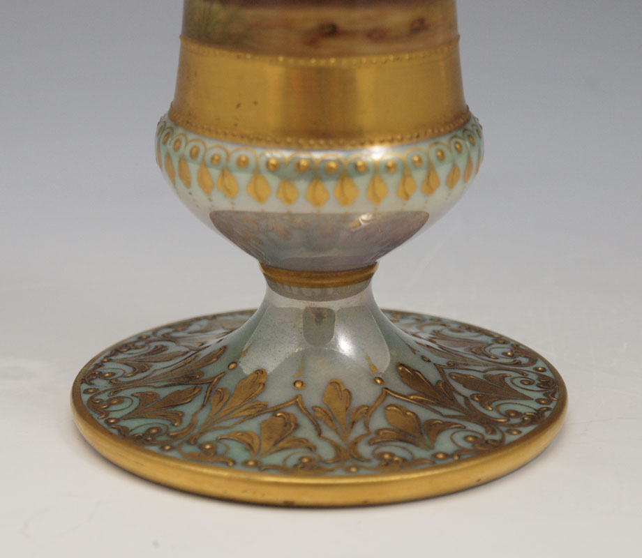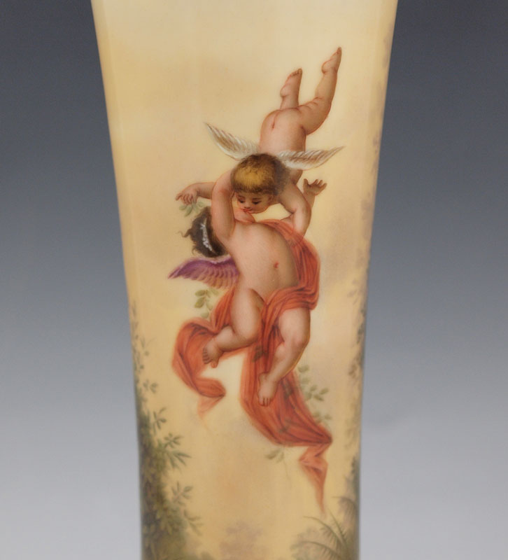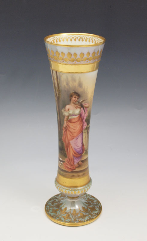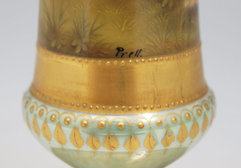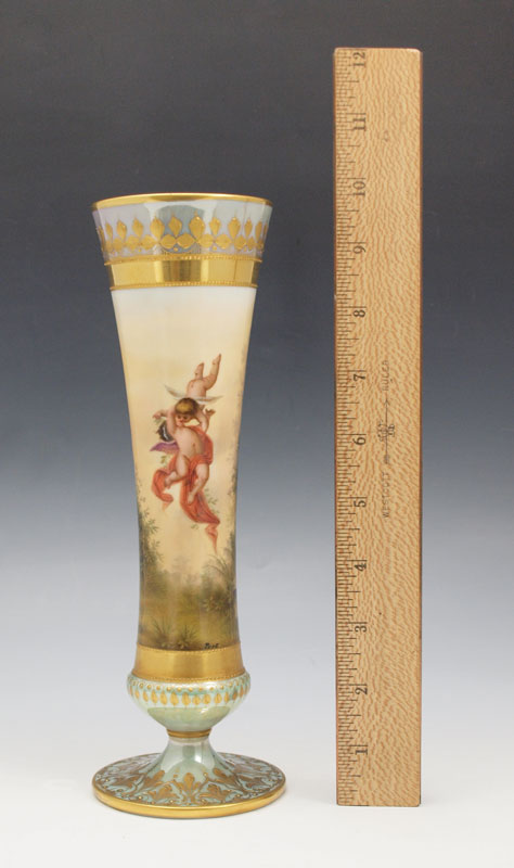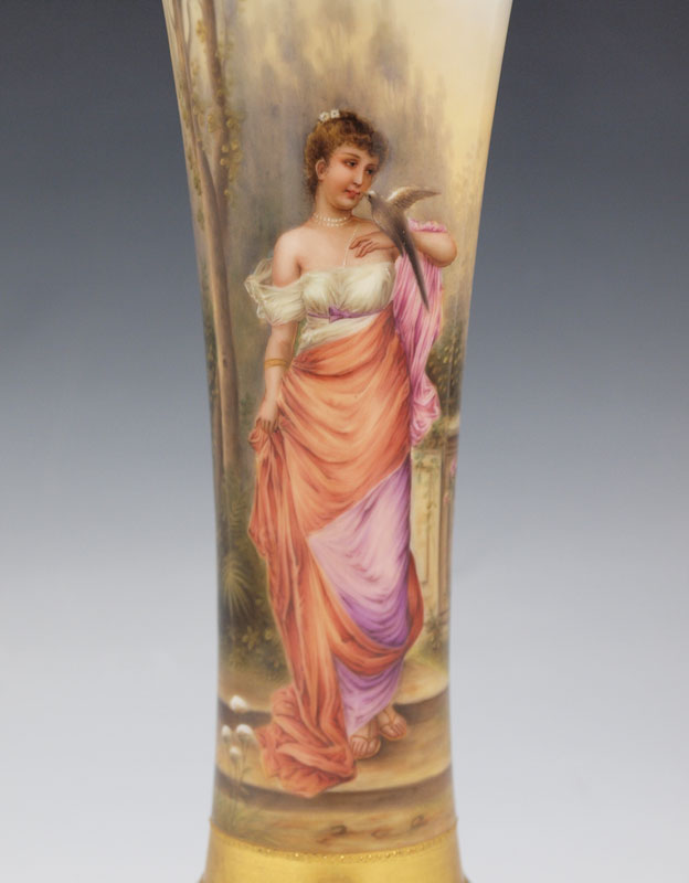 ROYAL VIENNA HAND PAINTED VASE: Heavy gilt embellishment. Image of a maiden with bird and cupid scene verso. Artist signed Prell. Blue bee hive mark over glaze. 9 3/4'' tall.