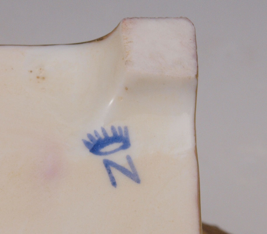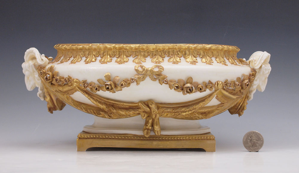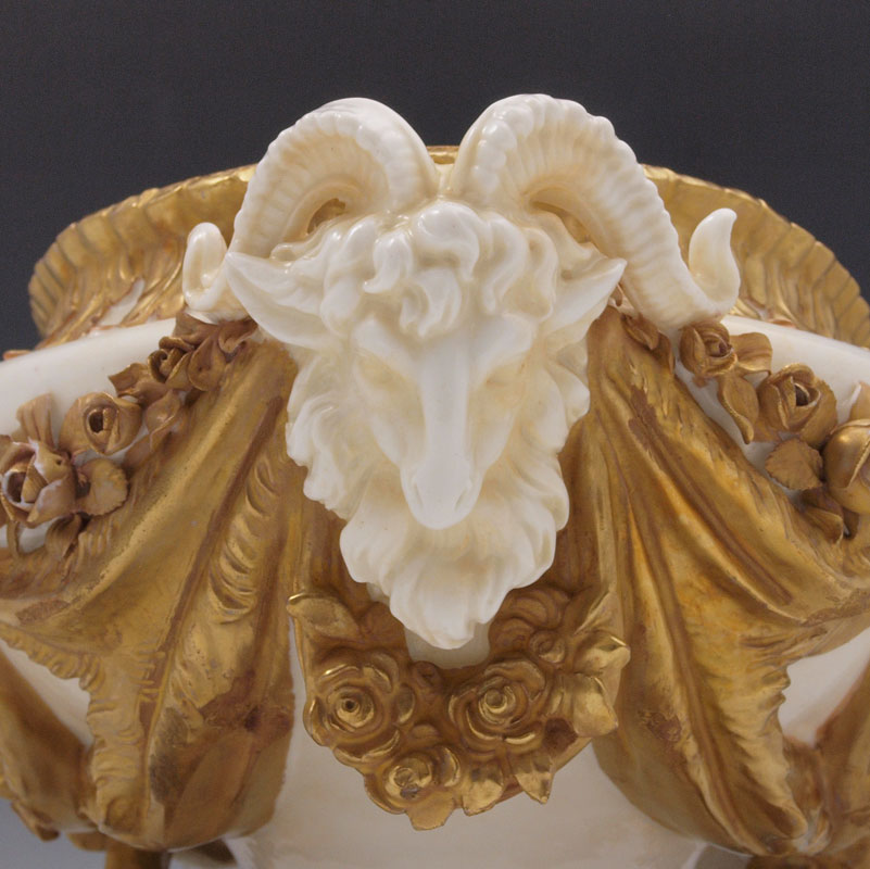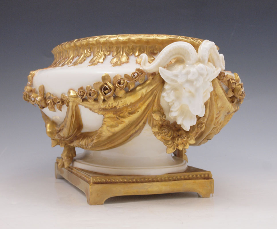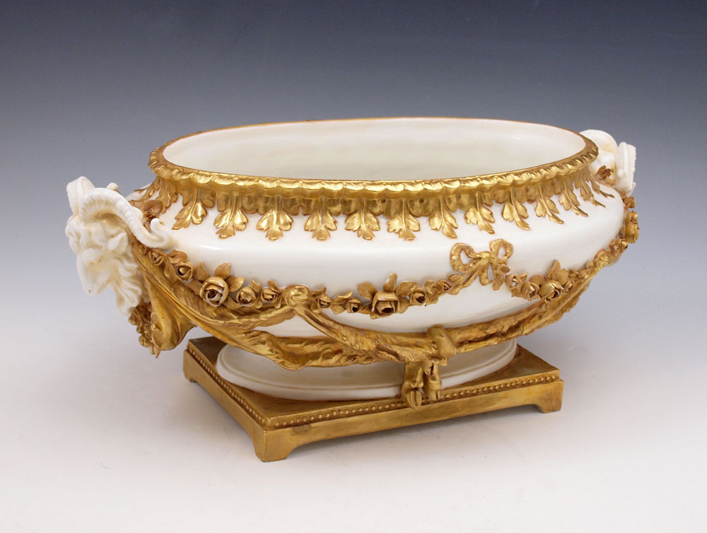 EARLY CAPO-DI-MONTE RAMS HEAD CENTER BOWL: Blanc de chine parcel gilt acanthus leaf rim and floral garland. N crown mark. 5''h. x 12''l.