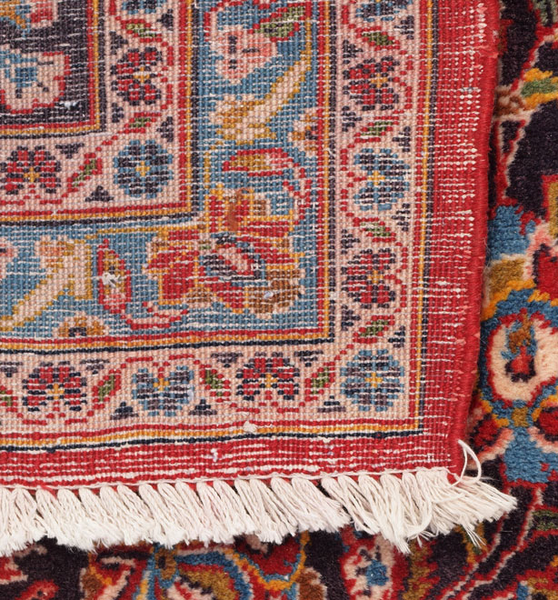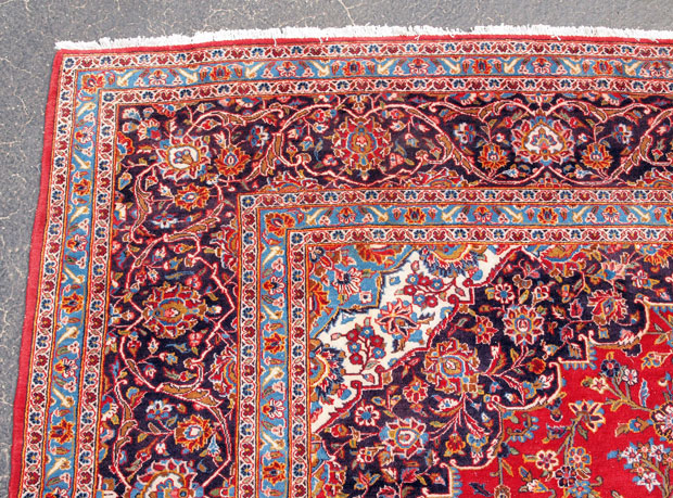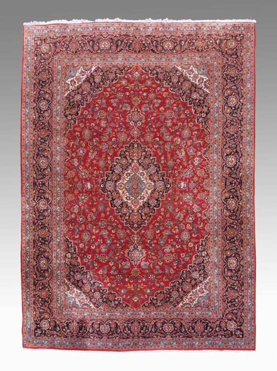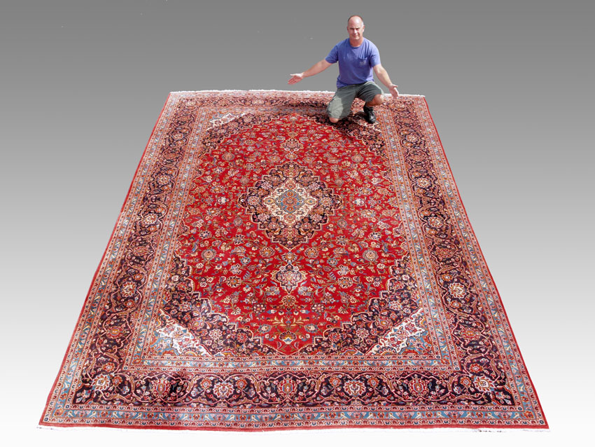 PERSIAN ISPHAHAN HAND KNOTTED WOOL RUG, 10' 5'' x 13' 10'': This very cheerful and vibrant rug has a bright red field with an overall floral background around an elongated central medallion of white, medium and dark blues and some yellow, condition is very good.