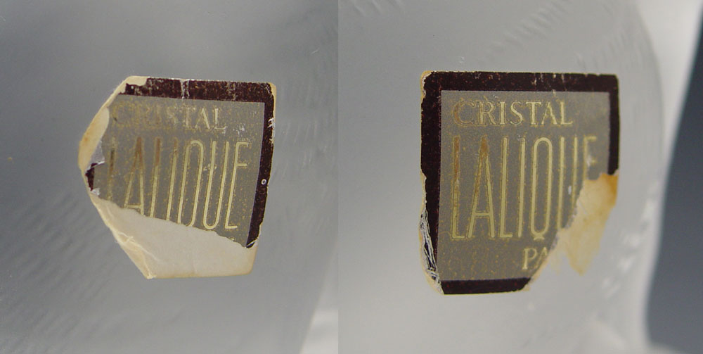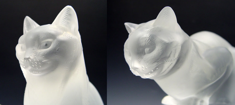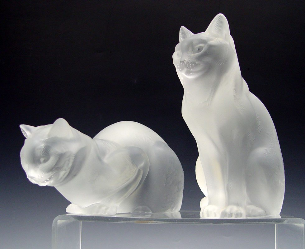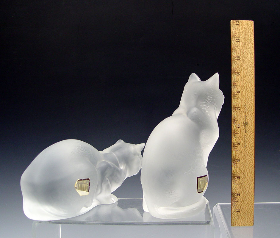 TWO LARGE LALIQUE CRYSTAL CATS: ''Chat Assis'' sitting cat, 8 1/4''h x 6 1/2'', signed Lalique France and partial paper label. ''Chat Chouche'' crouching cat, 3 1/2''h. x 9 1/2''.