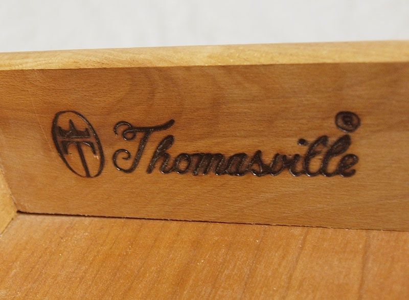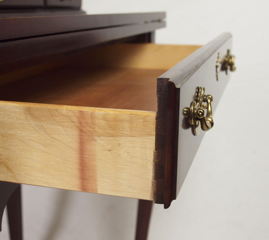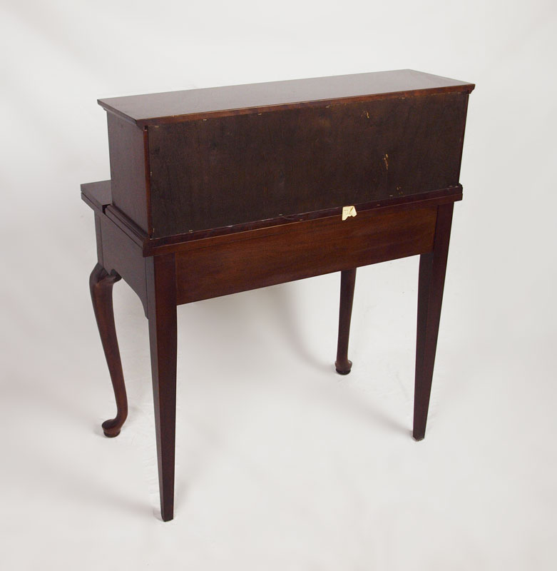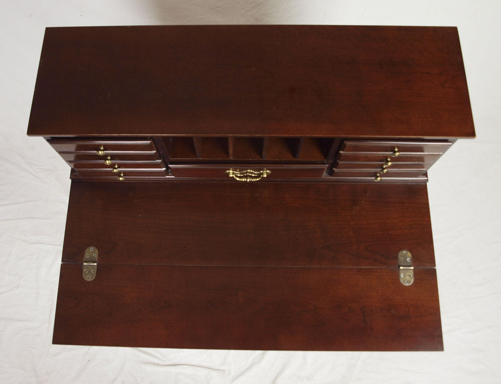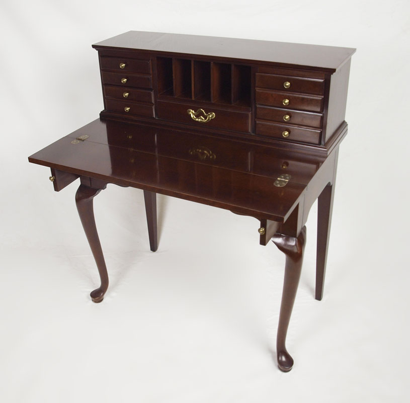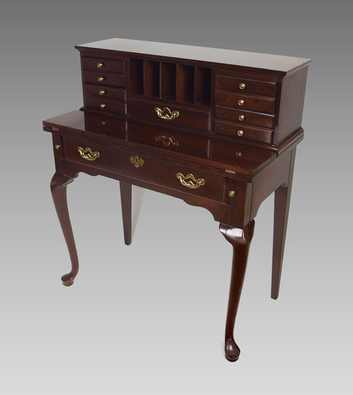 THOMASVILLE MAHOGANY LADIES WRITING DESK: Flip top supported by slides, upper section of pigeon holes and drawers. Measures 40'' x 34'' x 18''.