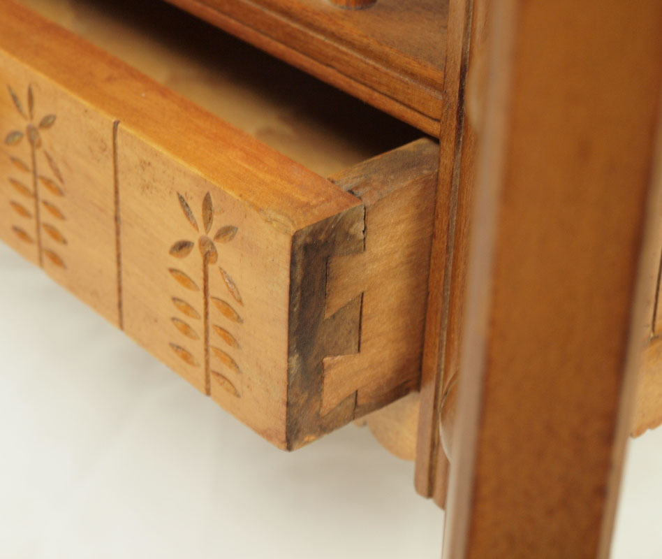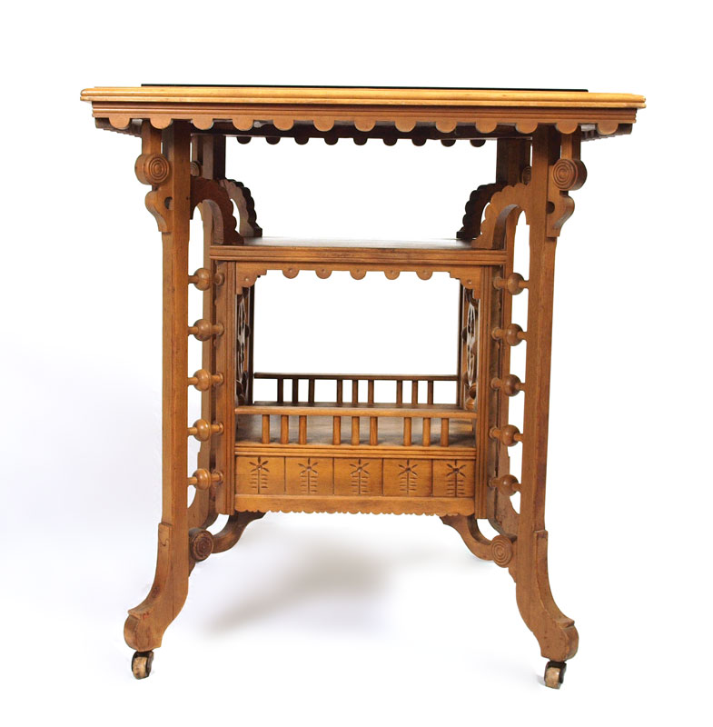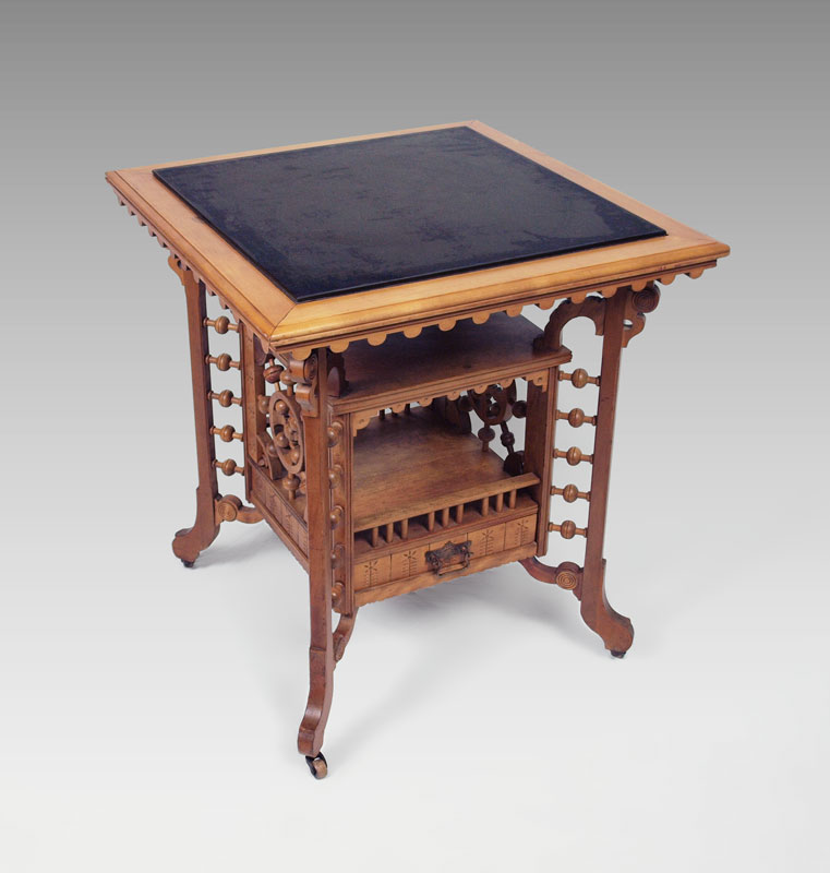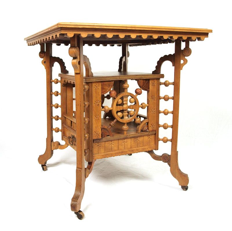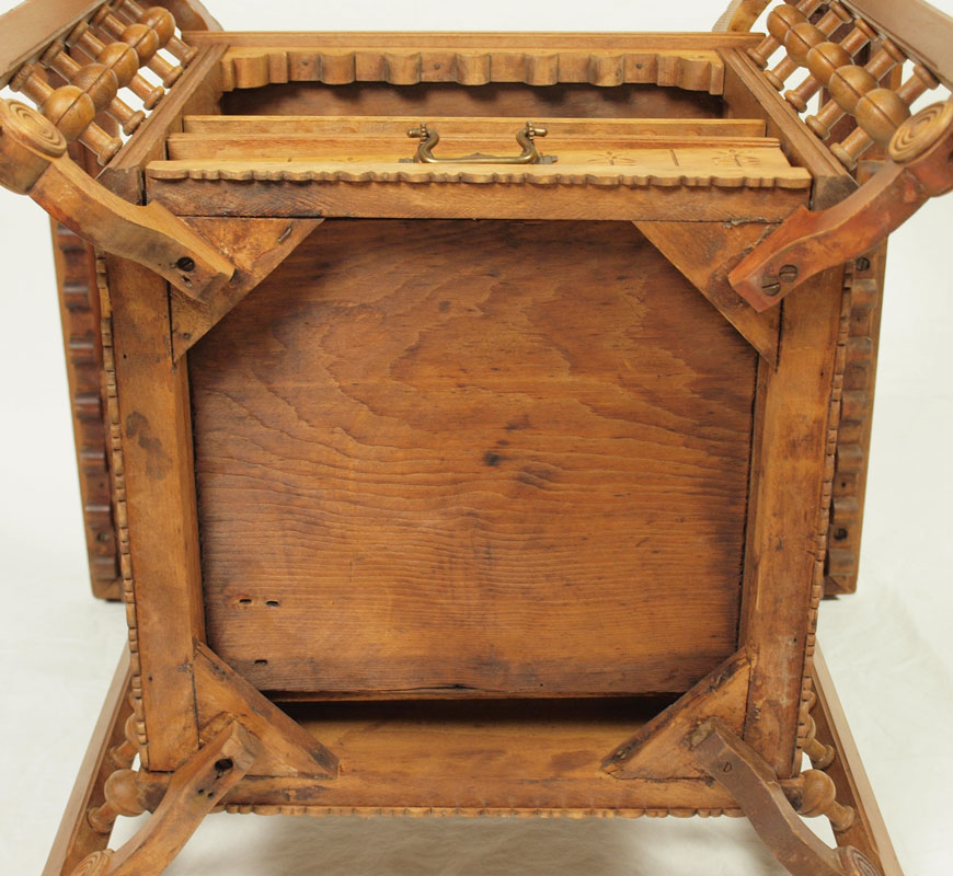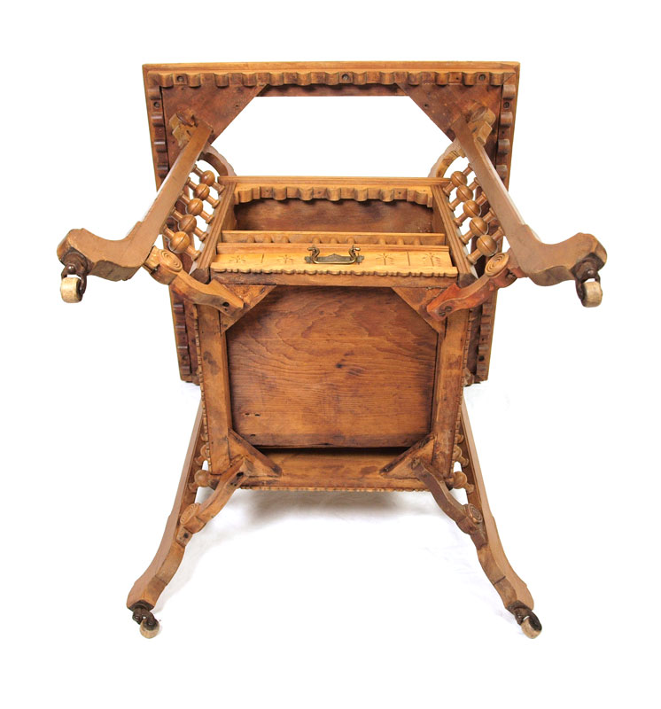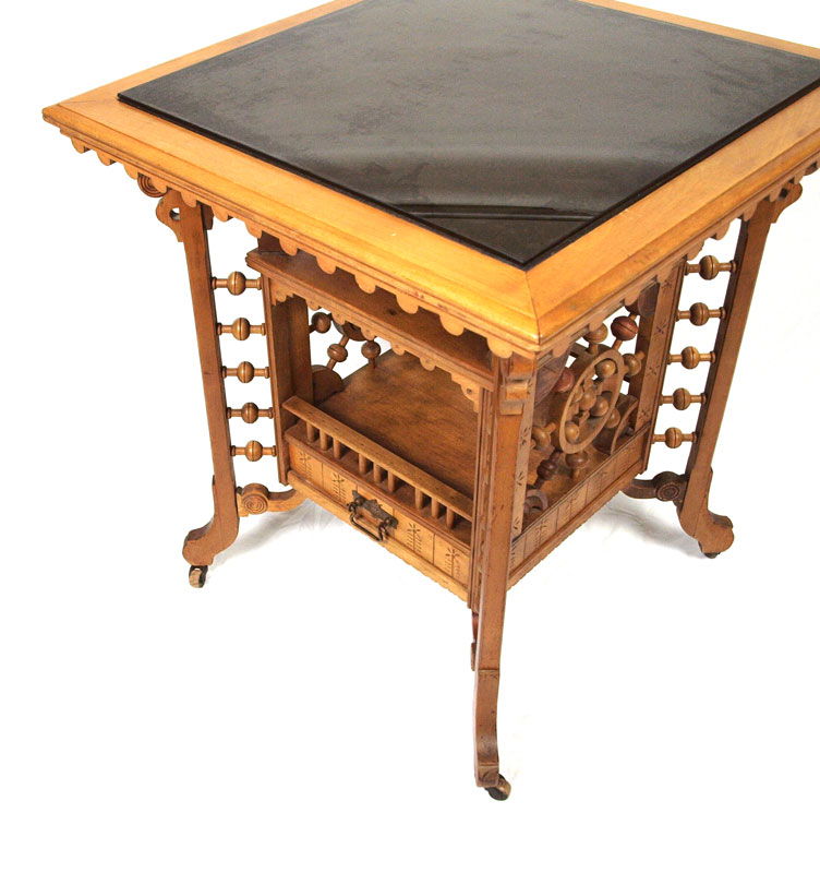 VICTORIAN MAPLE STICK AND BALL LAMP TABLE: Inset glass top supported by stick and ball design legs holding lower shelf with single drawer, metal pull and casters, 31''h. x 28'' square.