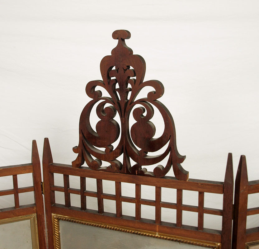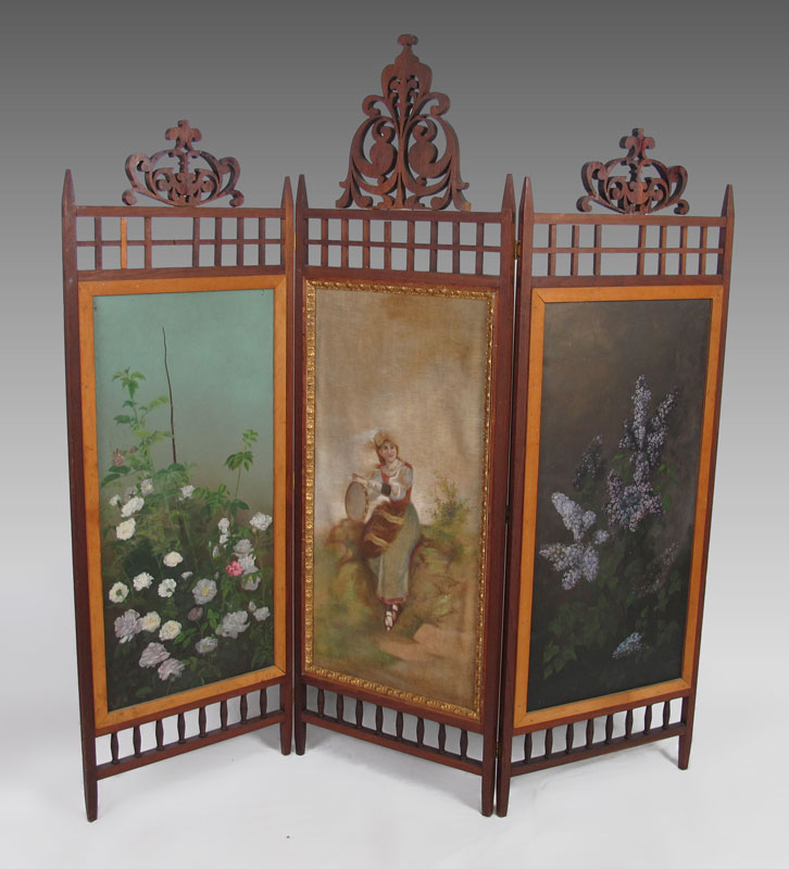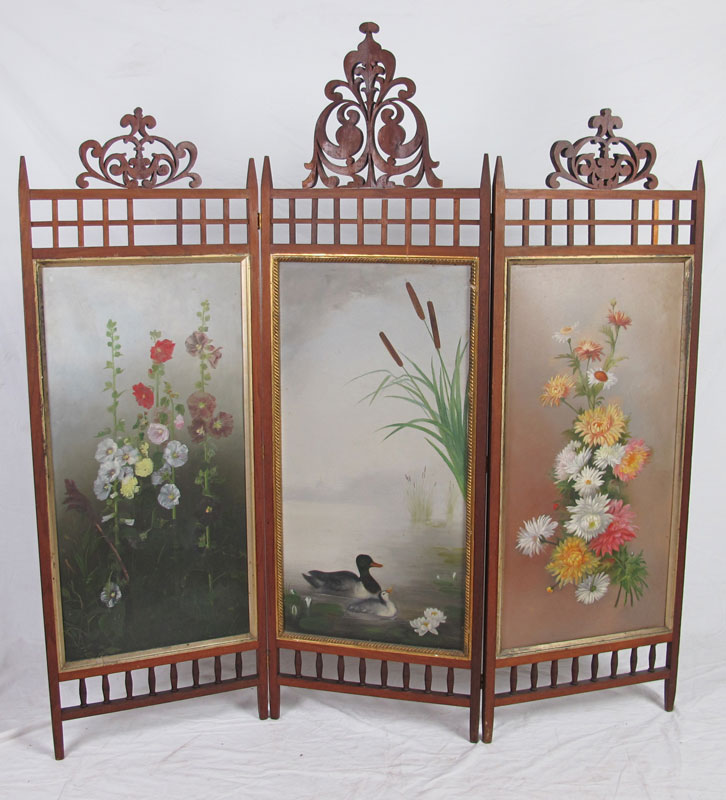 VICTORIAN 3 PANEL FOLDING SCREEN: Each panel trimmed with lattice work and cut crest, painted panels on all sides showing wild rose, dahlia, duck and cattail, hollyhocks, lilac, and girl with tambourine, center 65 1/2''h., end panels 58 1/4''h., each panel 20 3/4''w.