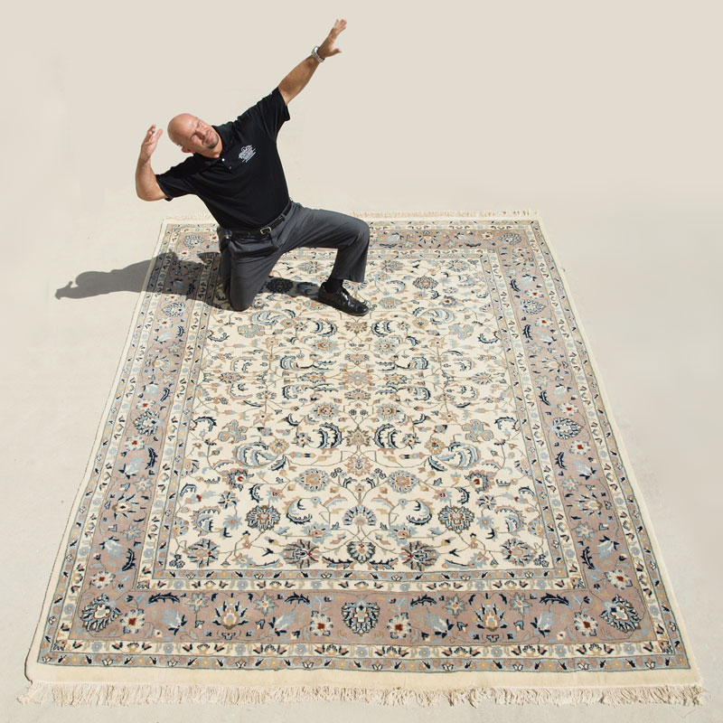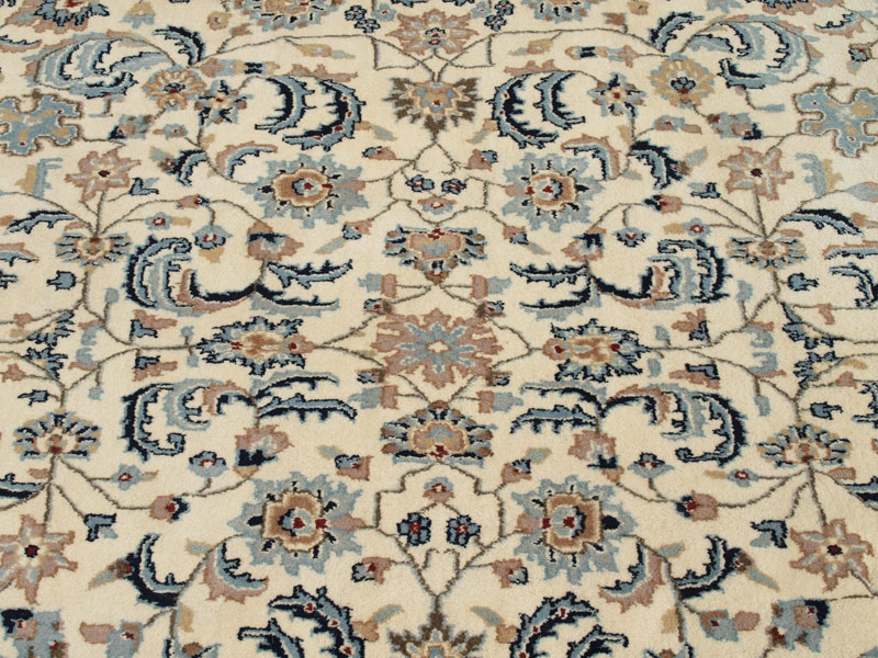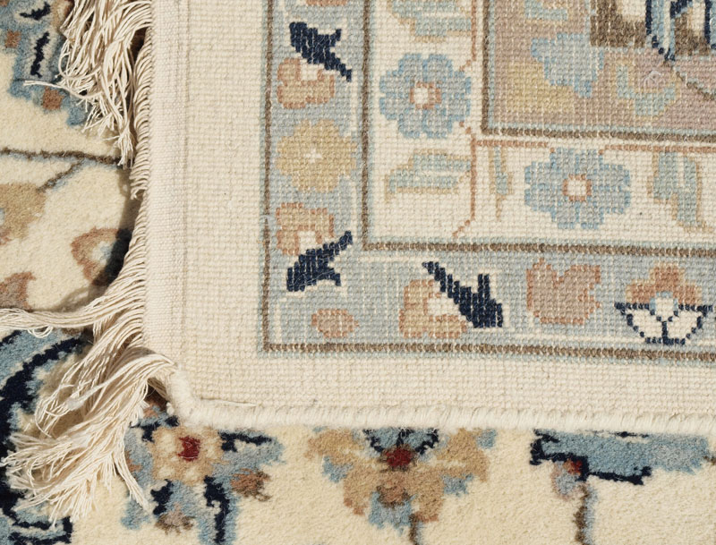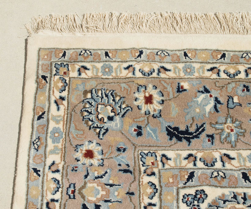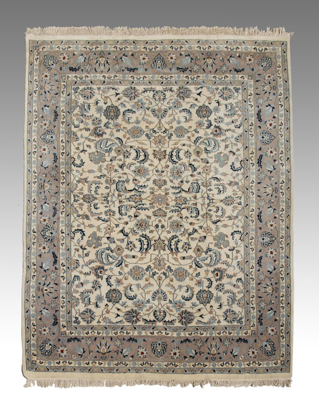 SINO-PERSIAN HAND KNOTTED WOOL RUG 9' x 12': This rug has soft colors, a white field ground covered by blue, gray, and green flowers and vines surrounded by a gray background main border, very good condition.