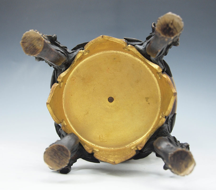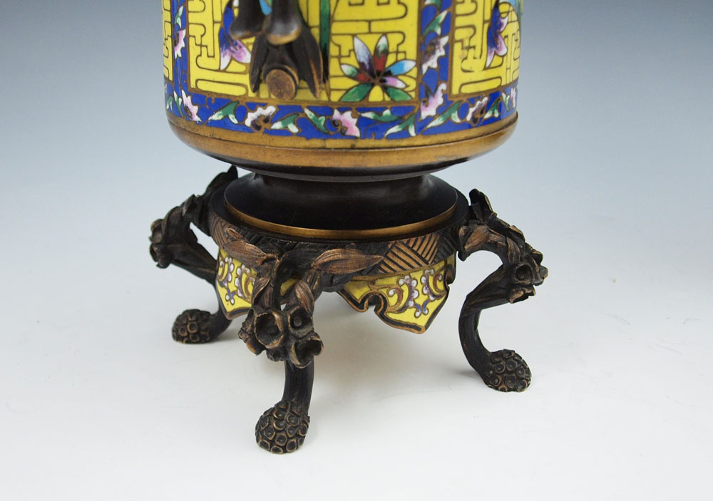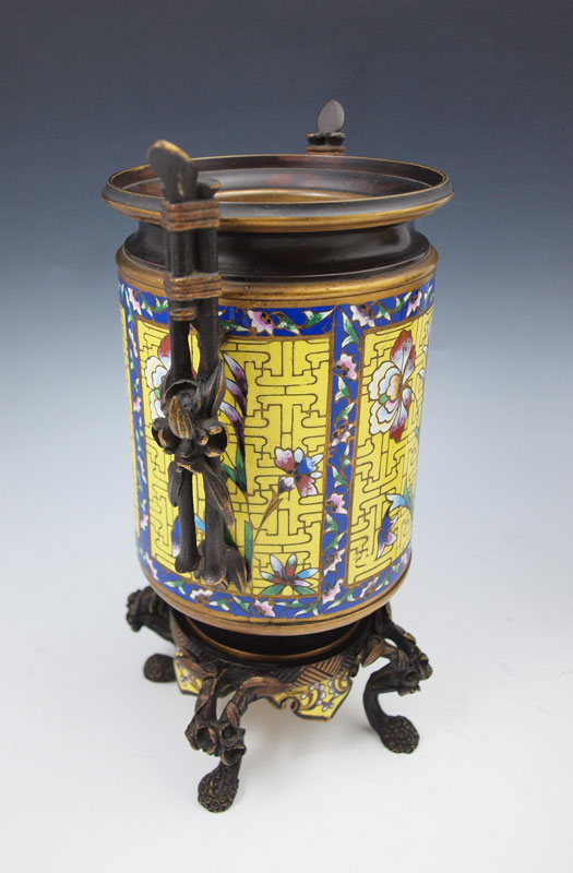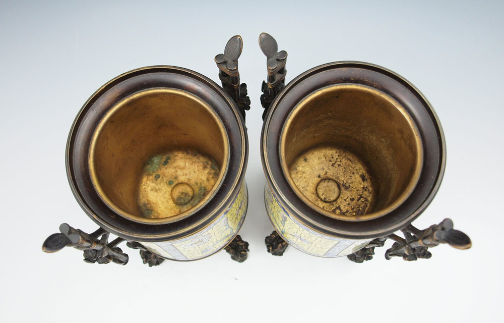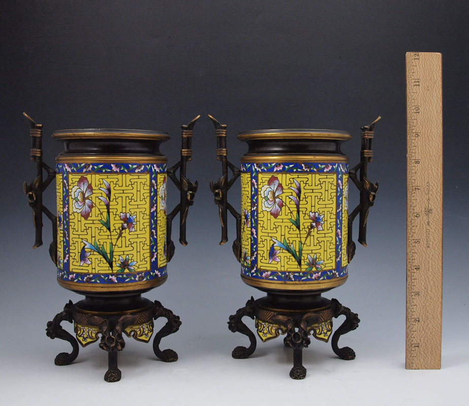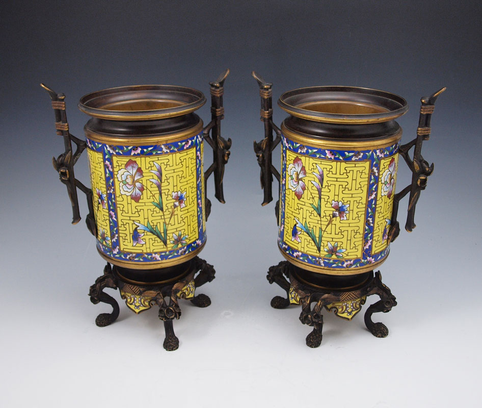 PAIR CHINESE BRONZE CLOISONNE HANDLED JARS: Floral design on bronze mounts. 9 3/4'' h. Finely detailed bronze handles and legs. Approx. 10'' tall.