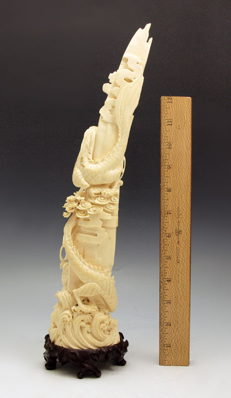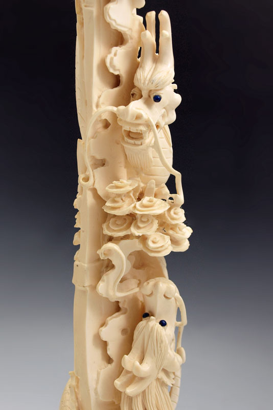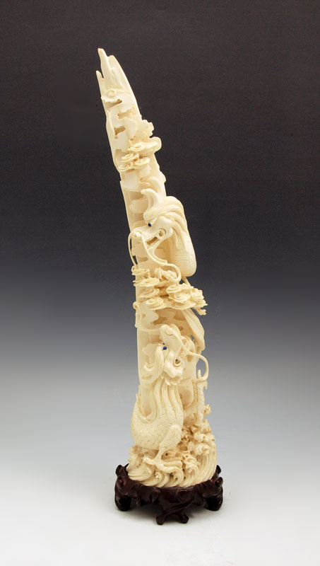 CARVED IVORY OF TWO DRAGONS: Finely detailed single tusk intertwined with two dragons. 14 1/2'' tall. Est. $600/800**