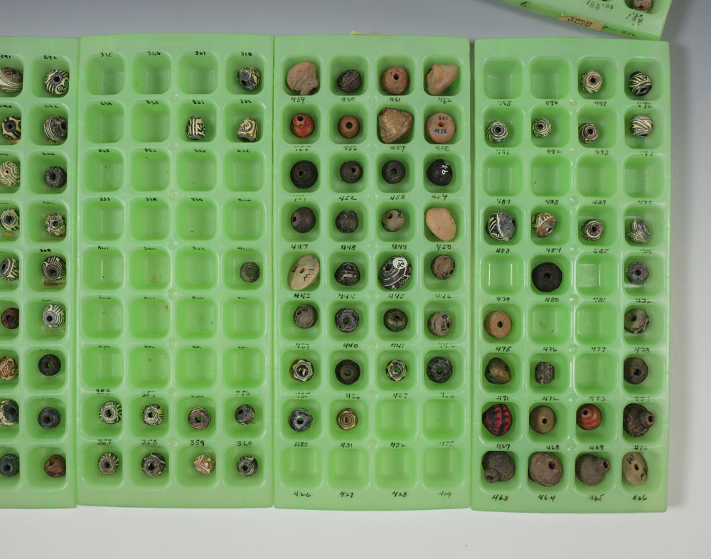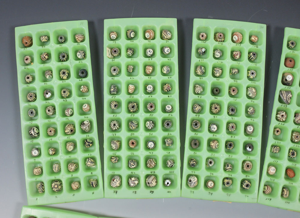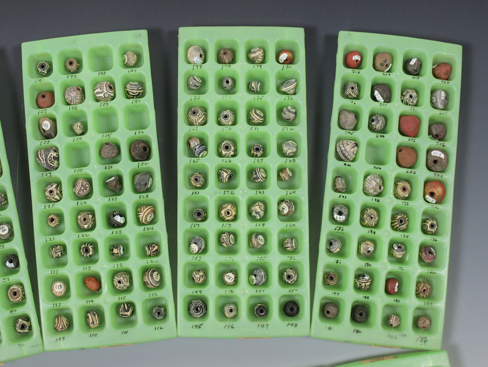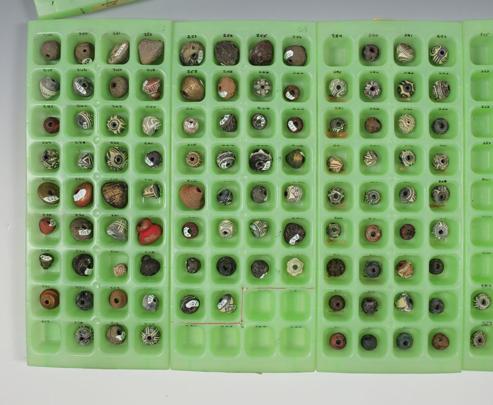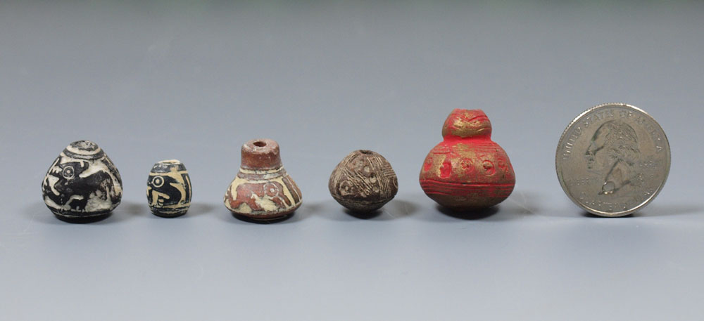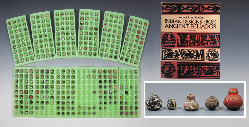 FREDERICK W SHAFFER COLLECTION OF PRE COLUMBIAN WHORLS: Approximately 378 numbered spindle whorls or weights and decorative beads that date back from 500 to 1500 A.D, many in perfect condition. Discovered in archeological digs in Ecuador, this unique collection features original designs and motifs created by the people of Ecuador, principally in Manabi and Guayas Provinces with over 250 being referenced in the collector/author written book ''Indian Designs from Ancient Ecuador''. The book is included with the sale of this amazing museum quality collection. Also included are the Authors tweezers and dental pick. Est. $2000/2500**