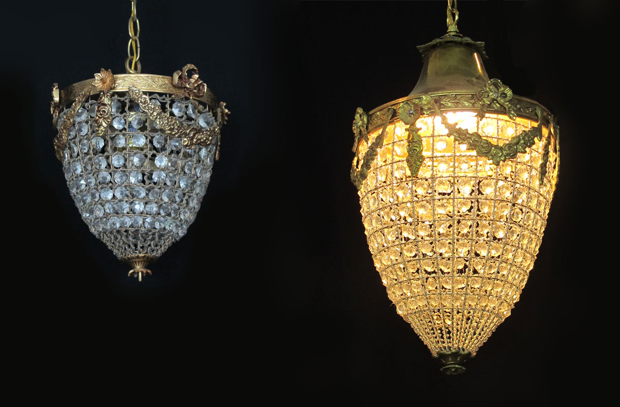 TWO BRASS AND CRYSTAL PENDANT CHANDELIERS: On extra long chains, a smaller version than the bigger. The larger measuring approx. 20''l, the smaller, 12''. Measurements do not include the chain.