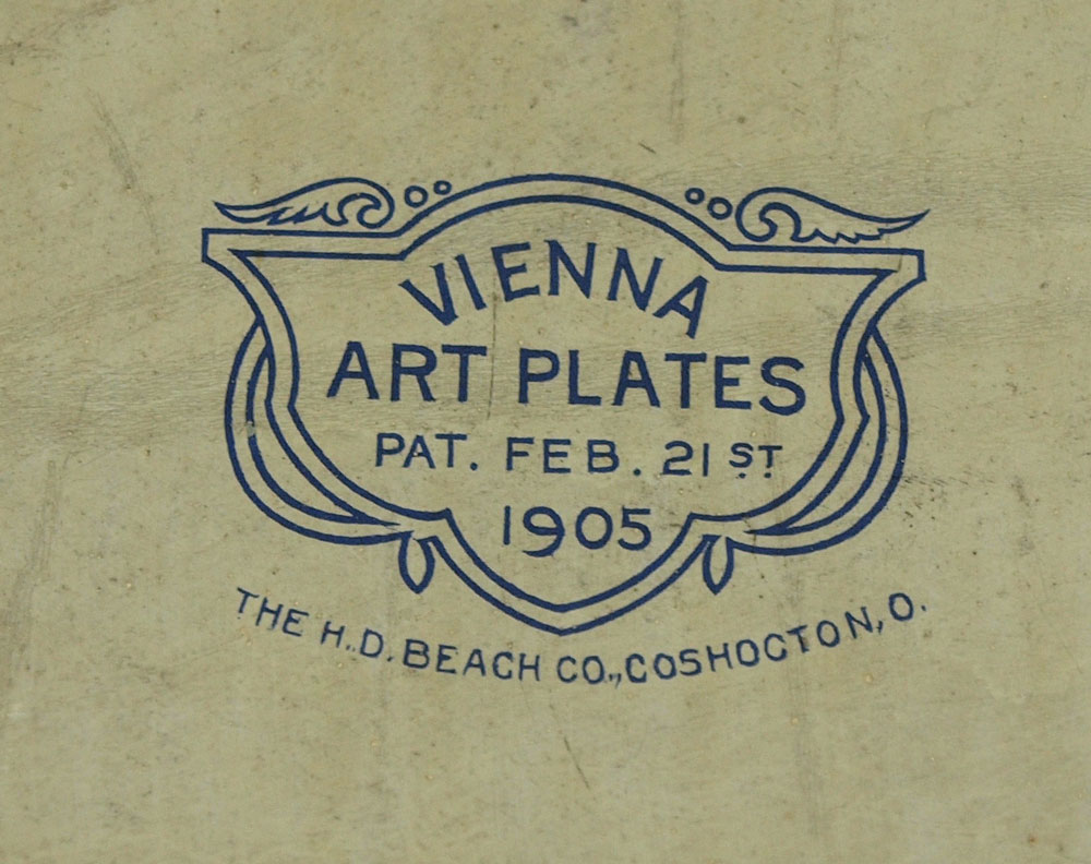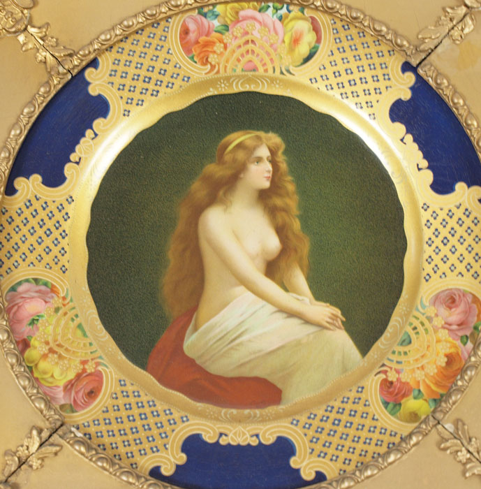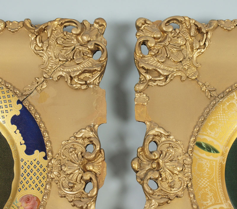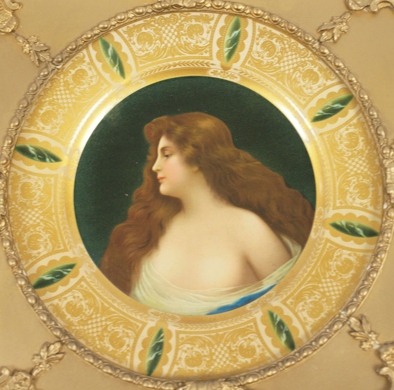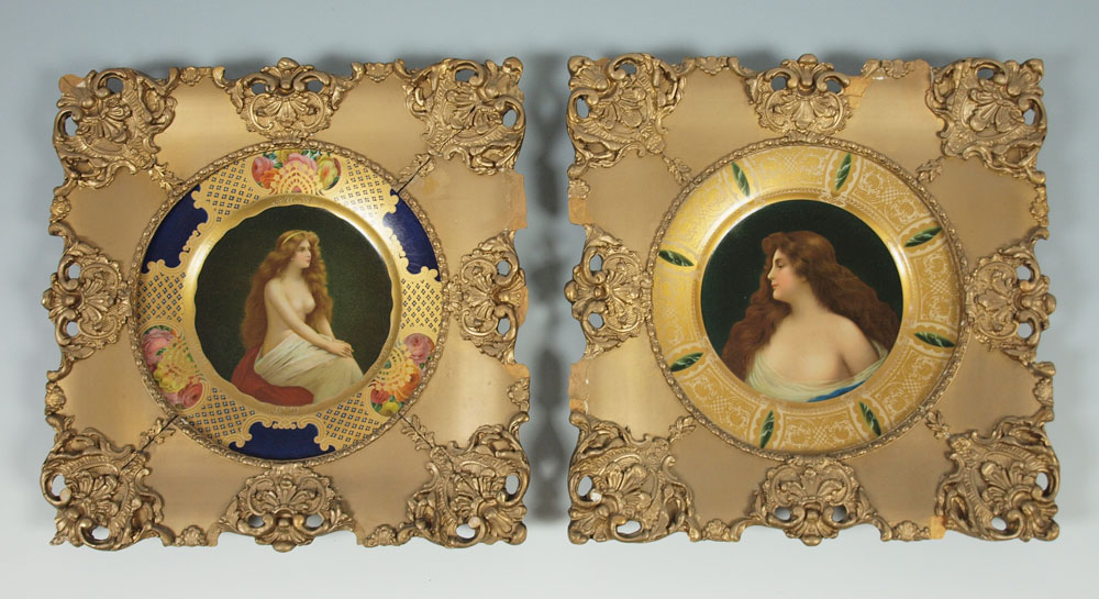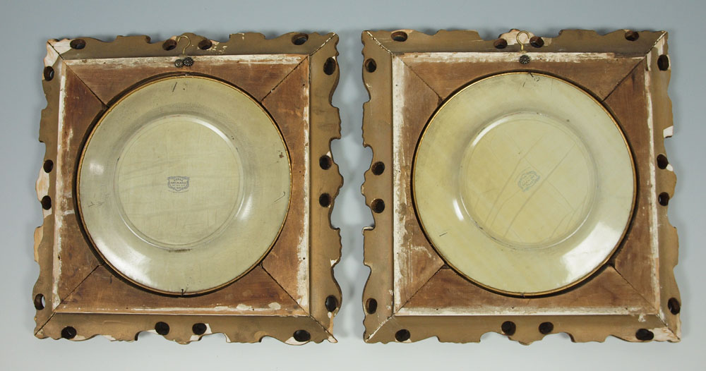 TWO VIENNA ART PLATES: In gilt gesso and wood frames. The tin plates are 10'' dia. The frames 14.5 x 14.5. Gesso loss on the frames.
