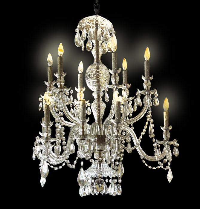 MONUMENTAL 12 LIGHT GLASS CHANDELIER: Dripping in crystal prisms and chains. Approx. 40''l. x 34'' dia., excluding the chain.