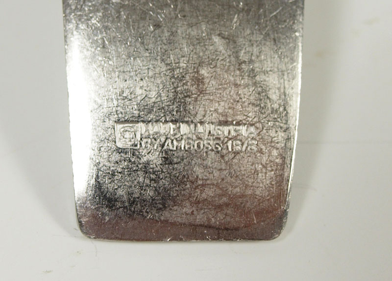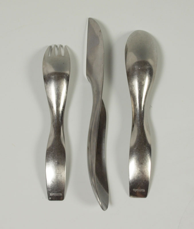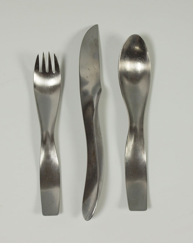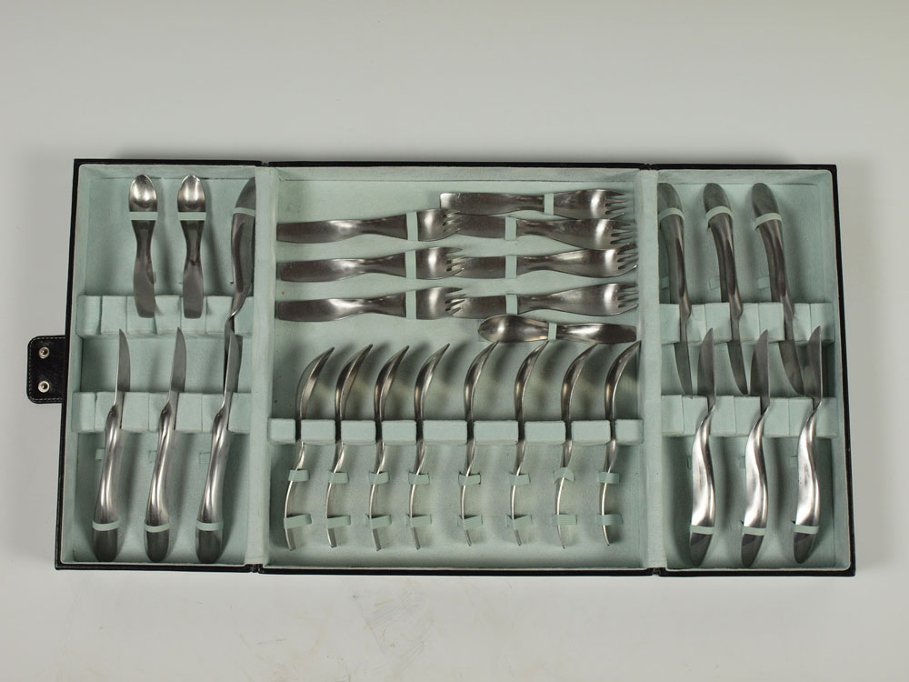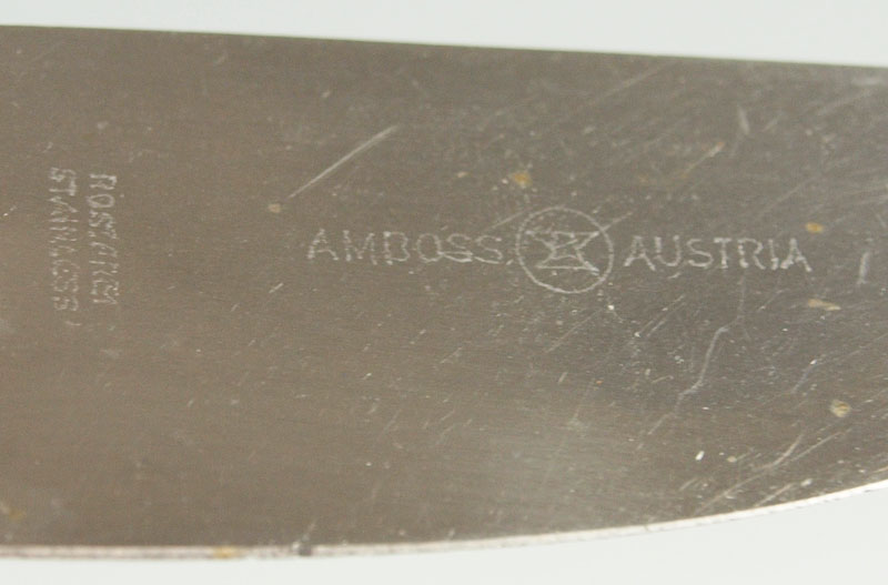 AMBOSS STAINLESS FLATWARE IN PRESENTATION CASE: Nice mid century moderne design to include 7 forks (7''), 8 spoons (7 3/8''), 3 spoons (5 7/8''), 10 knives (8 3/8''). Marked Amboss Austria. Comes in faux leather presentation case, 4 1/2'' x 14 5/8'' x 13 1/2''.