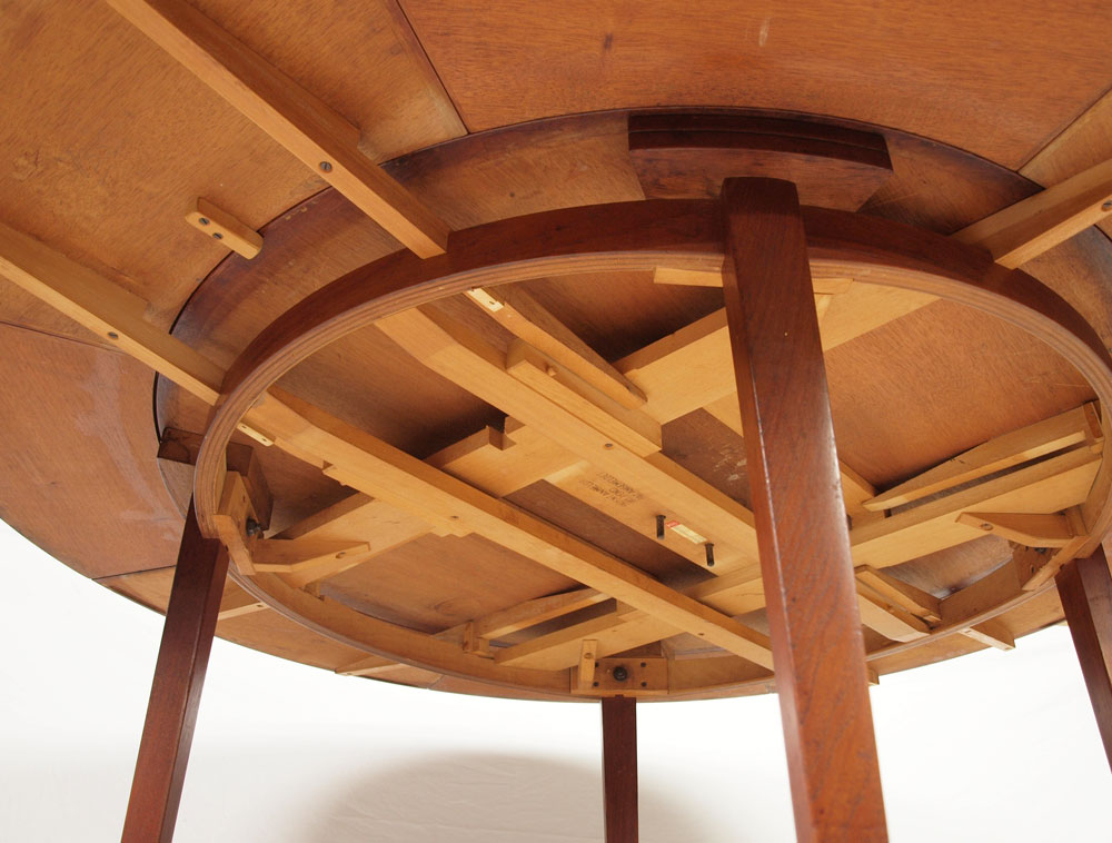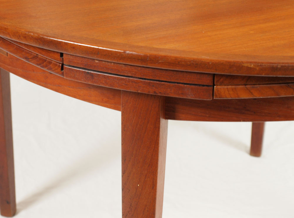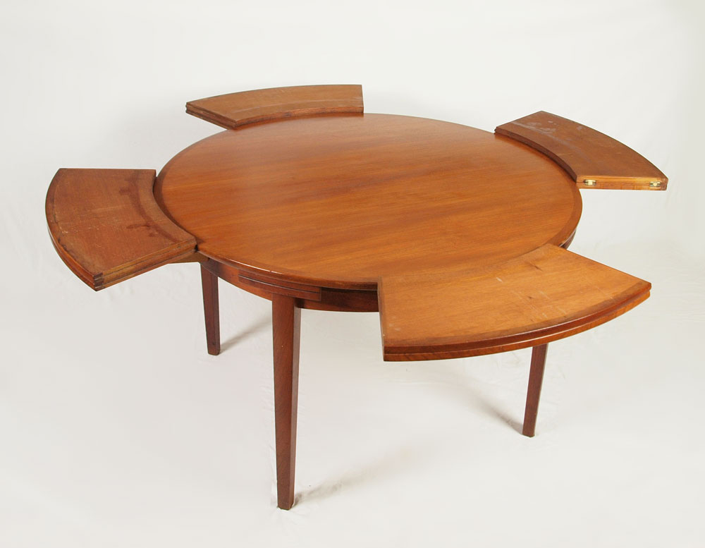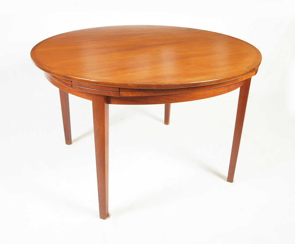 DYRLUND DANISH MODERN ROUND EXTENSION TABLE: Metamorphic Dyrlund Danish Modern circular dining table with conforming draw leaf extensions raised on tapering legs, 28 3/4'' h. X 47 1/4'' dia.
