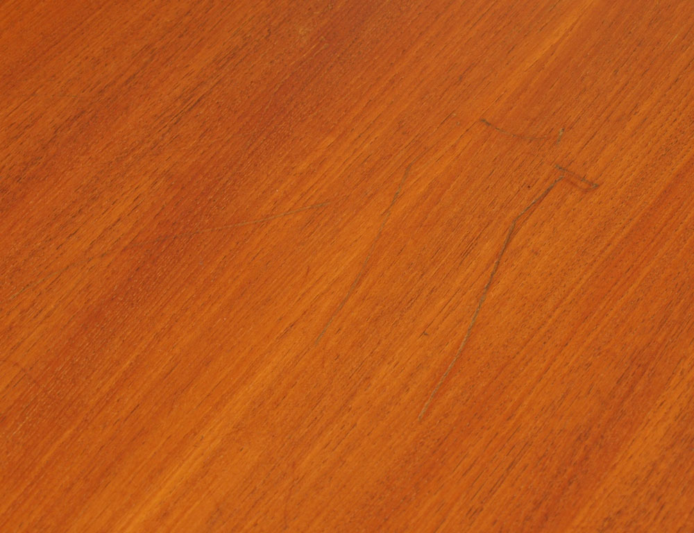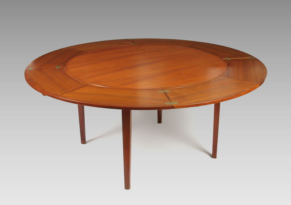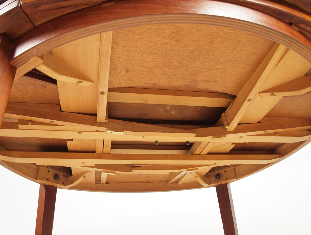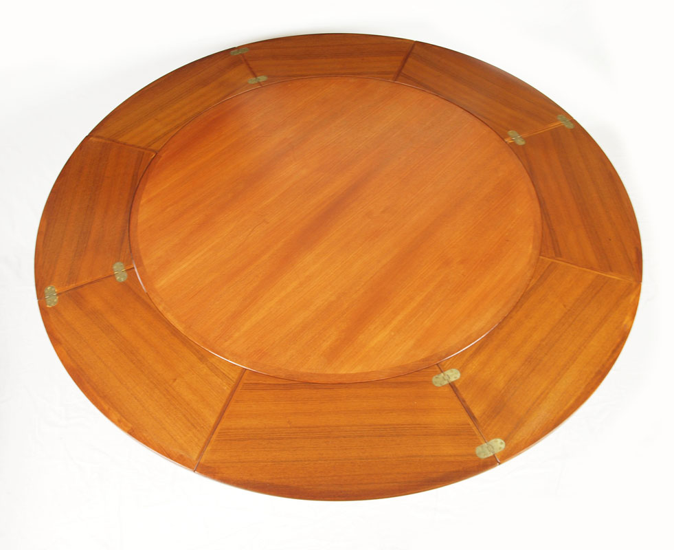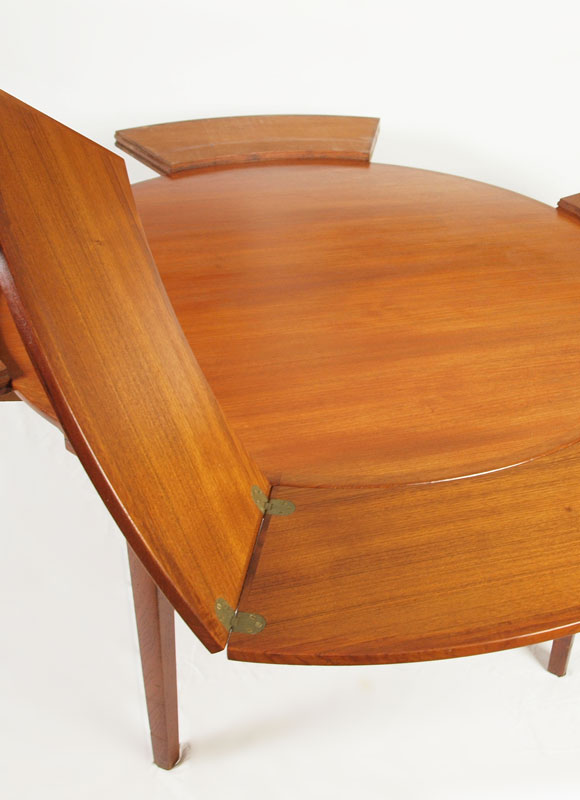 DYRLUND DANISH MODERN ROUND EXTENSION TABLE: Metamorphic Dyrlund Danish Modern circular dining table with conforming draw leaf extensions raised on tapering legs, 28 3/4'' h. X 47 1/4'' dia.
