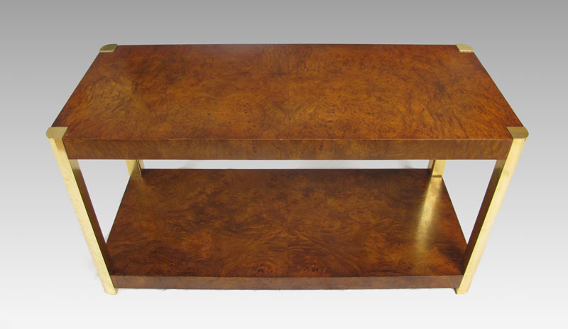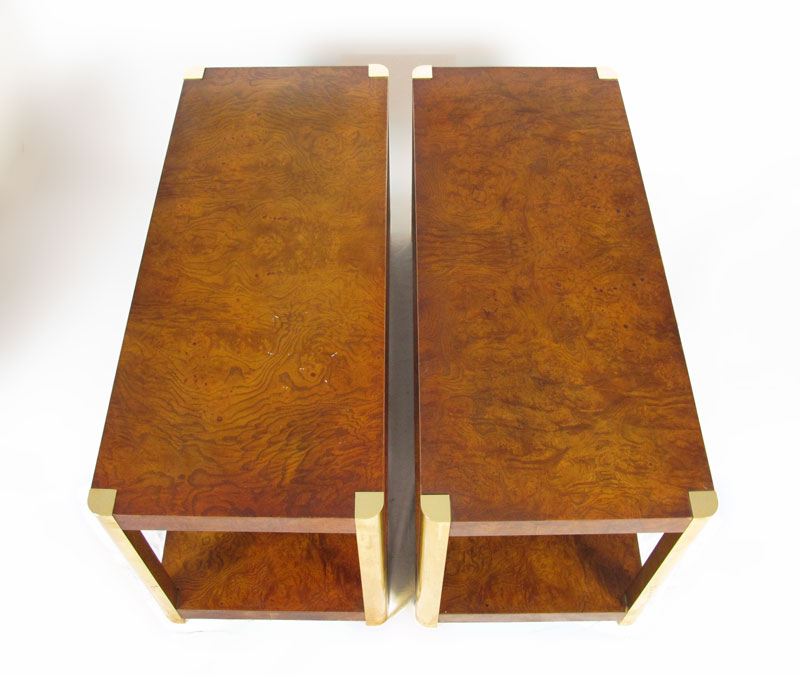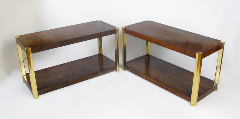 PAIR SOBOTA FOR CENTURY FURNITURE ''COMPOSITION NUMBER TWO'' SIDE TABLES: Ash burl veneer with brass. As stated in the brochure ''Composition Number Two is the juxtaposition of the old and the sleekly new''. 22'' tall x 42'' x 18''. Provence: Estate of Ray Sobota.
