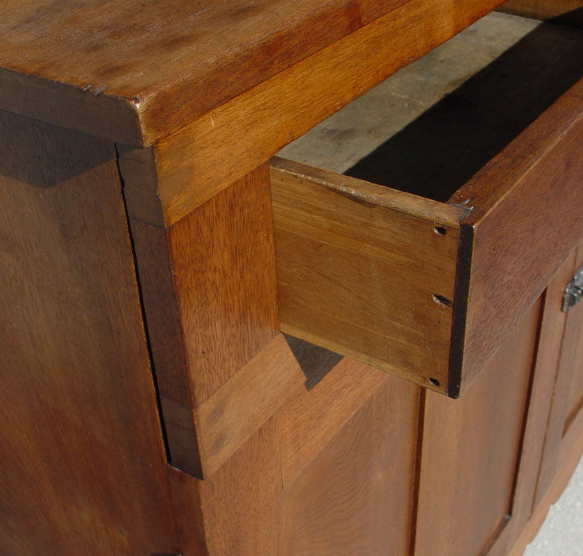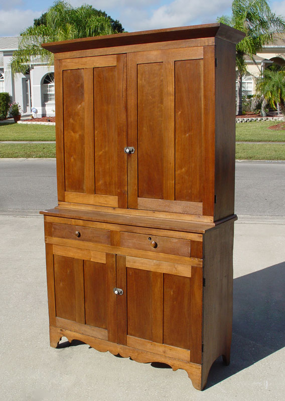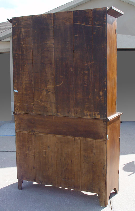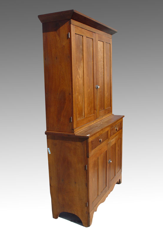 MID 19TH C AMERICAN BIRCH BLIND FRONT STEP BACK CUPBOARD: 2 double paneled upper doors with 2 interior shelves, topped with crown molding, base with 2 drawers over 2 doors, also double panel, on high cut bracket base, 86 1/2''h. x 50''w. x 19 1/2''d.