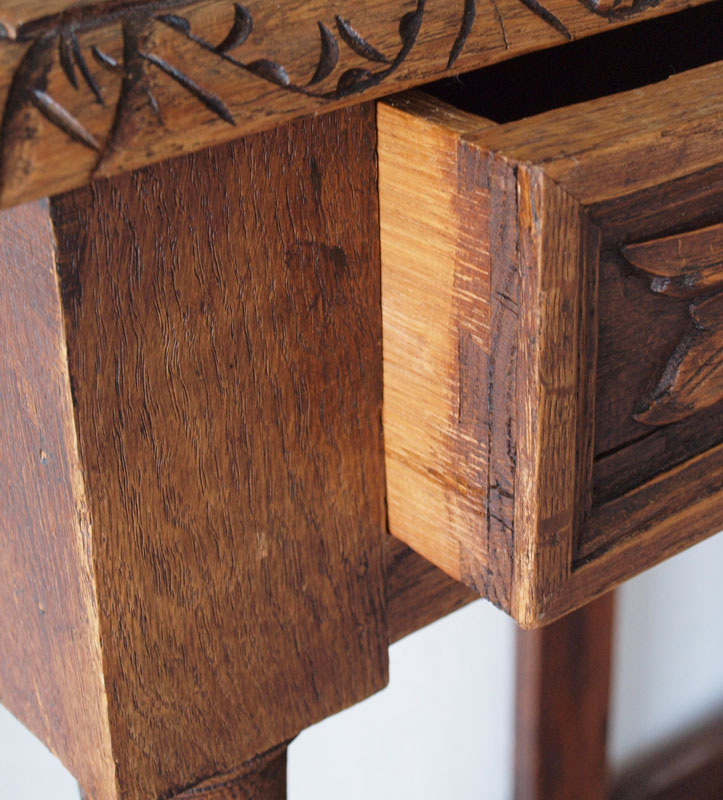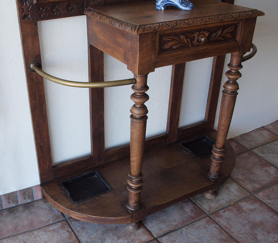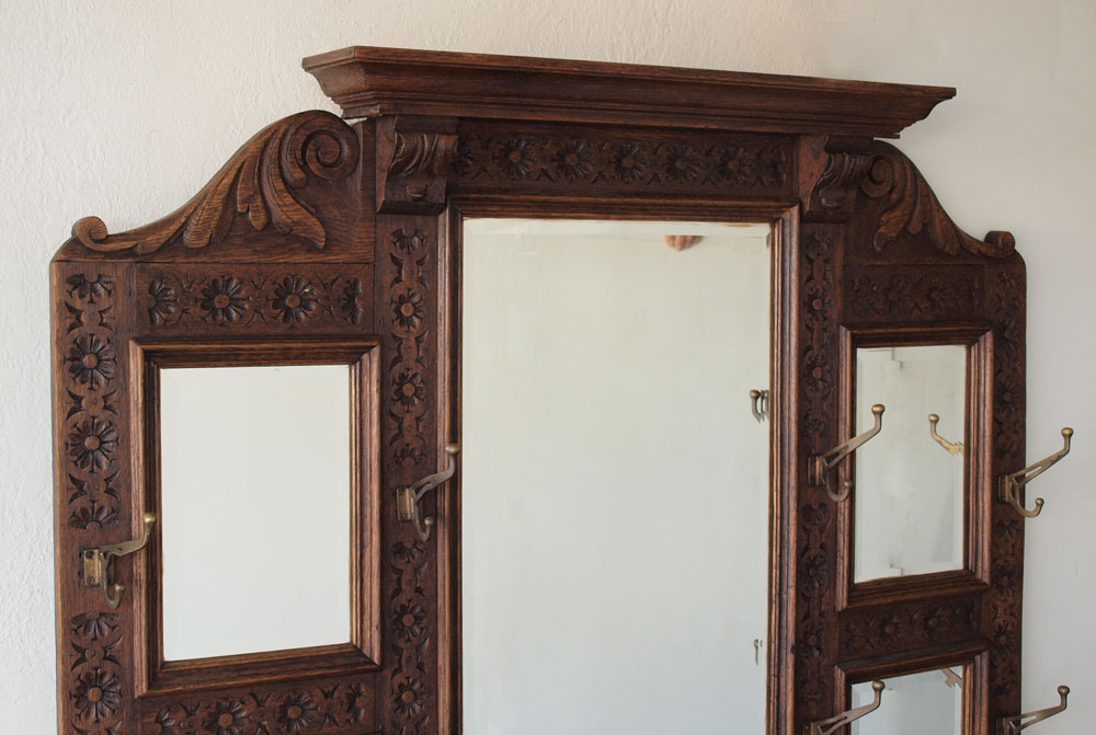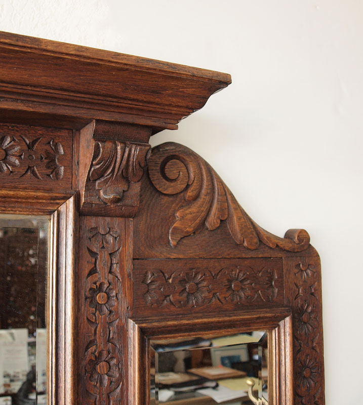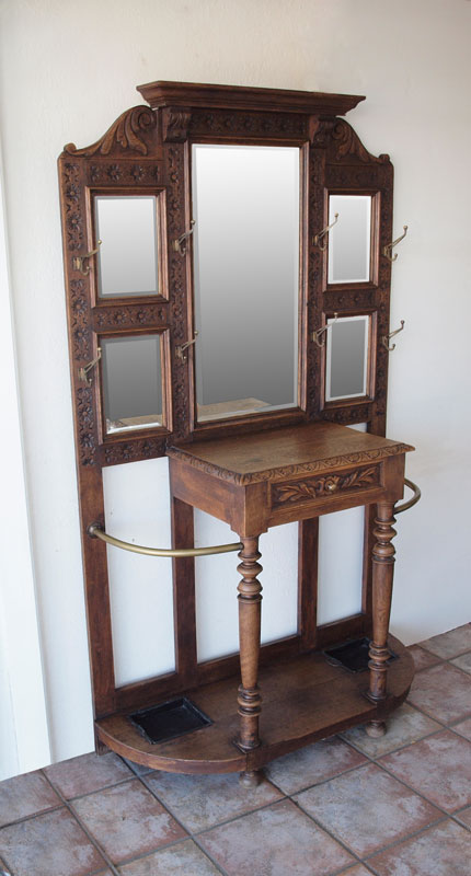 EARLY 20th C CARVED OAK HALL TREE: With single drawer, 5 beveled mirrors, 8 hooks, brass umbrella rails and original pans. 72'' x 43'' x 16''.