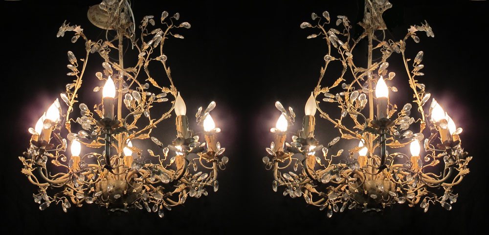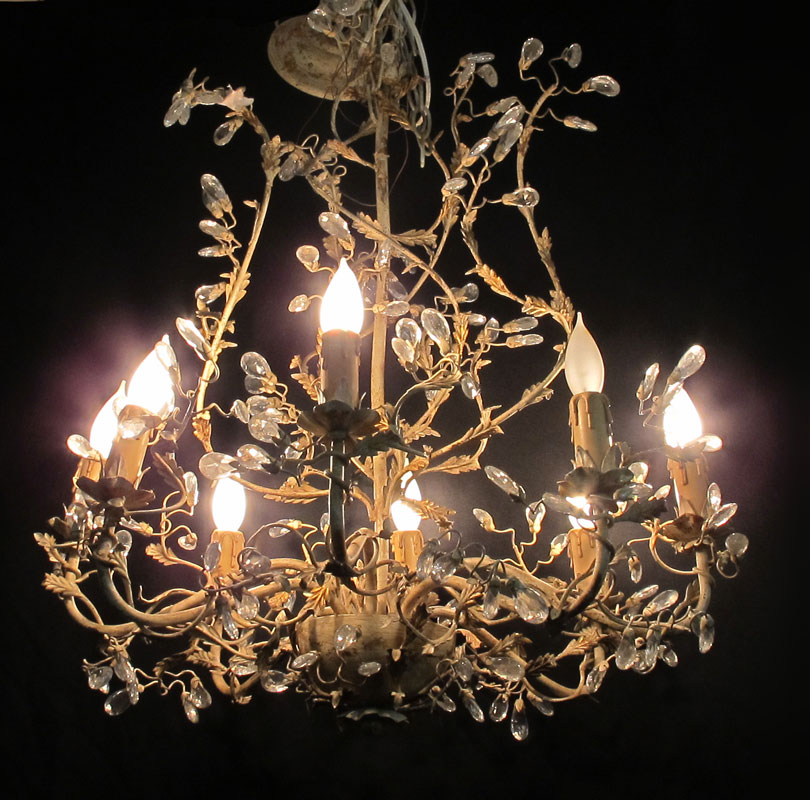 PAIR OF GILT METAL CHANDELIERS: Contemporary shabby chic painted metal with gilt embellishment, crystal drops. Approx. 27'' h. x 20'' dia. excluding chain.