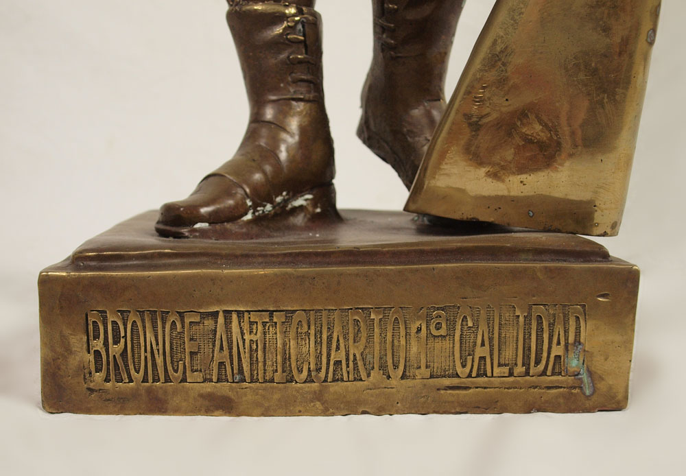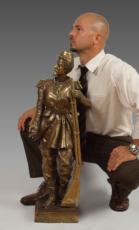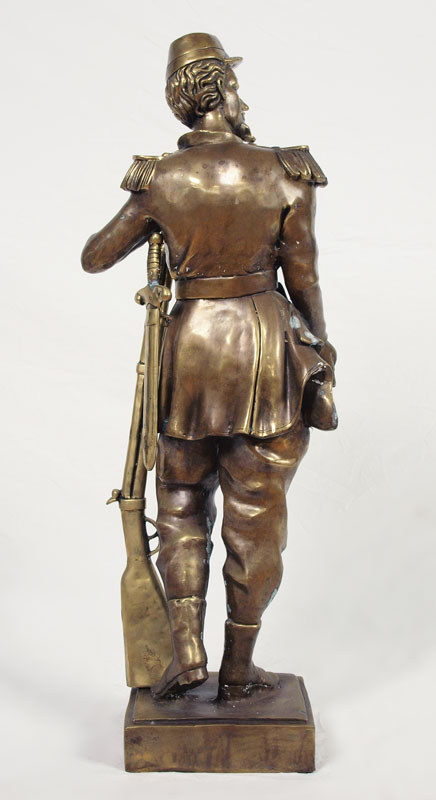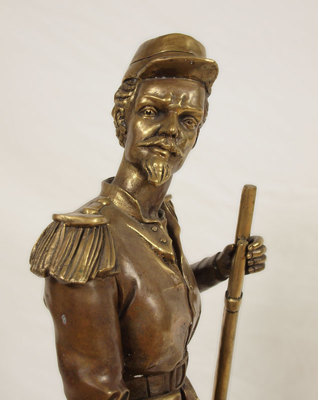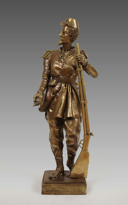LARGE BRONZE CIVIL WAR SOLDIER: Bronze of solider, appears to be Civil War, with rifle and removable artillery sword. Unsigned, cast on base reads ''Bronce Anticuario 1 a Calidad''. Approx. 36 1/4'' x 13'' x 9''.
