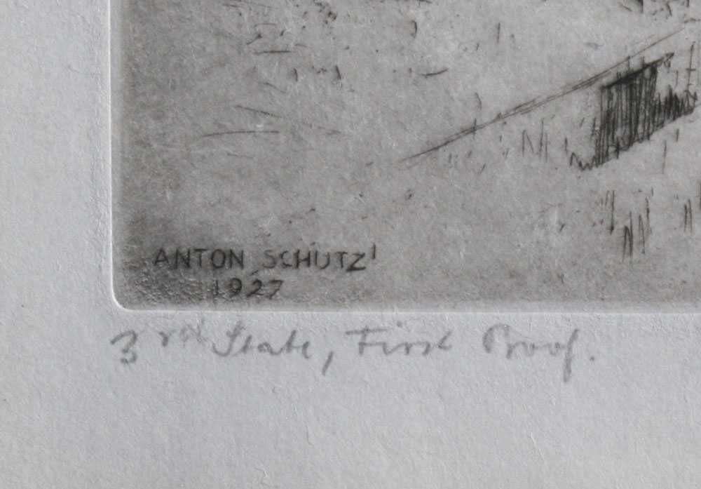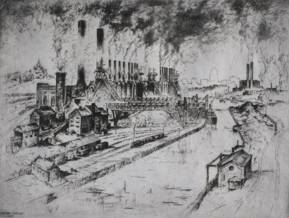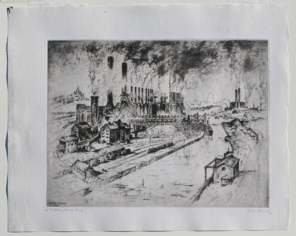 SCHUTZ, Anton, (American, 1894-1977): ''Cleveland Steel Mills'', etching, 3rd state, first proof, 1927, 9'' x 12'', pencil signed a proof aside from edition of 100, black frame, 17'' x 20 1/2'', archivally matted. Est. $300/500**
