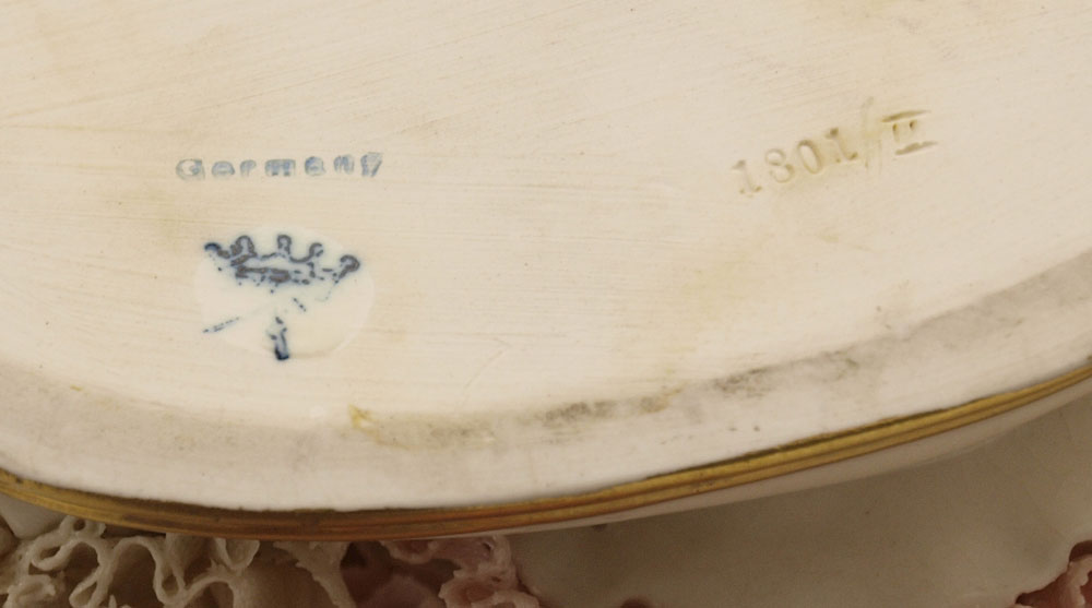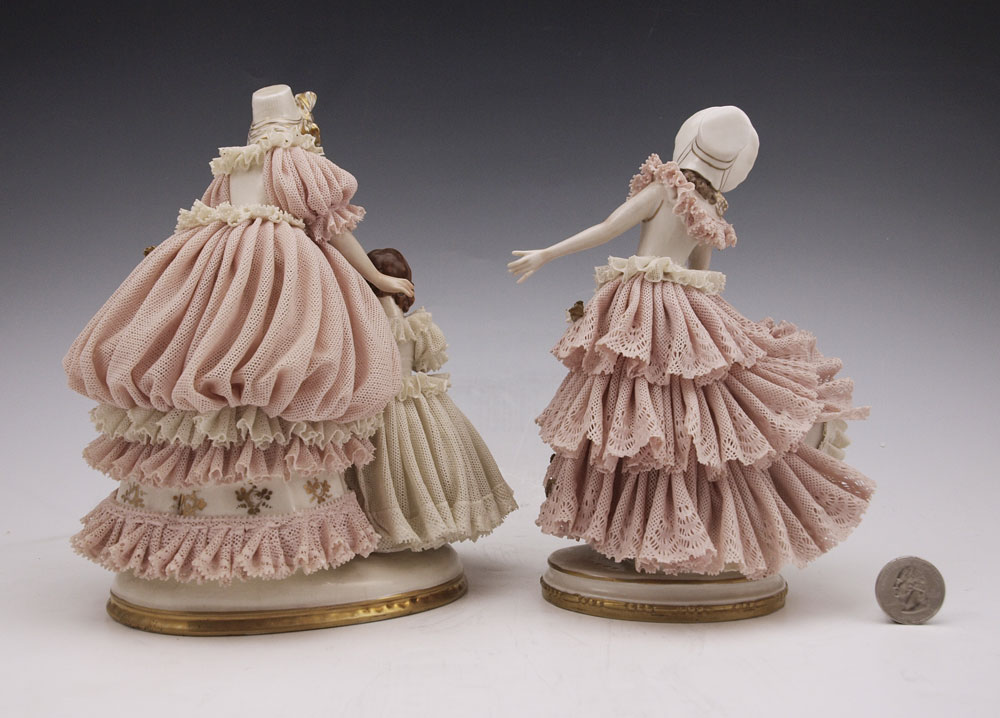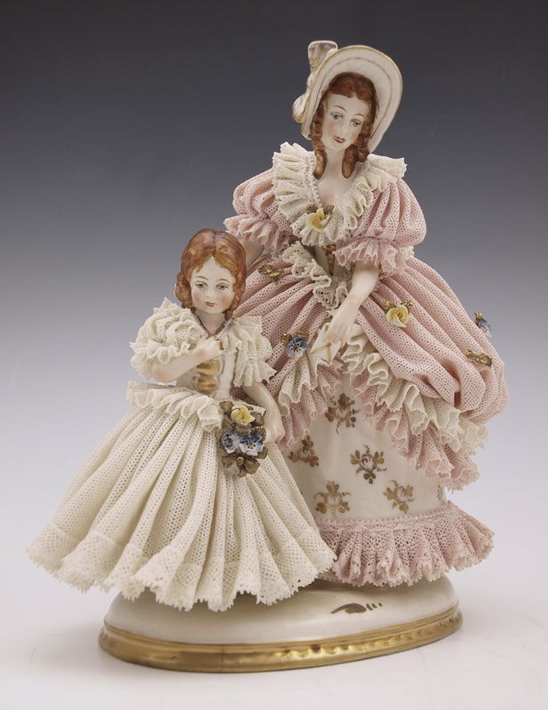 TWO FURSTENBERG LACY FIGURINES: 1) Figural group of woman with a child, 8'' x 7'' overall. 2) Furstenberg Single figure in pink dress and bonnet, 7 1/2'' x 6''.