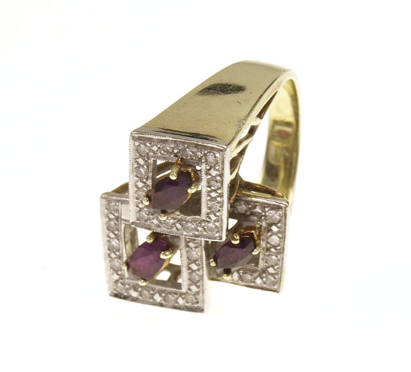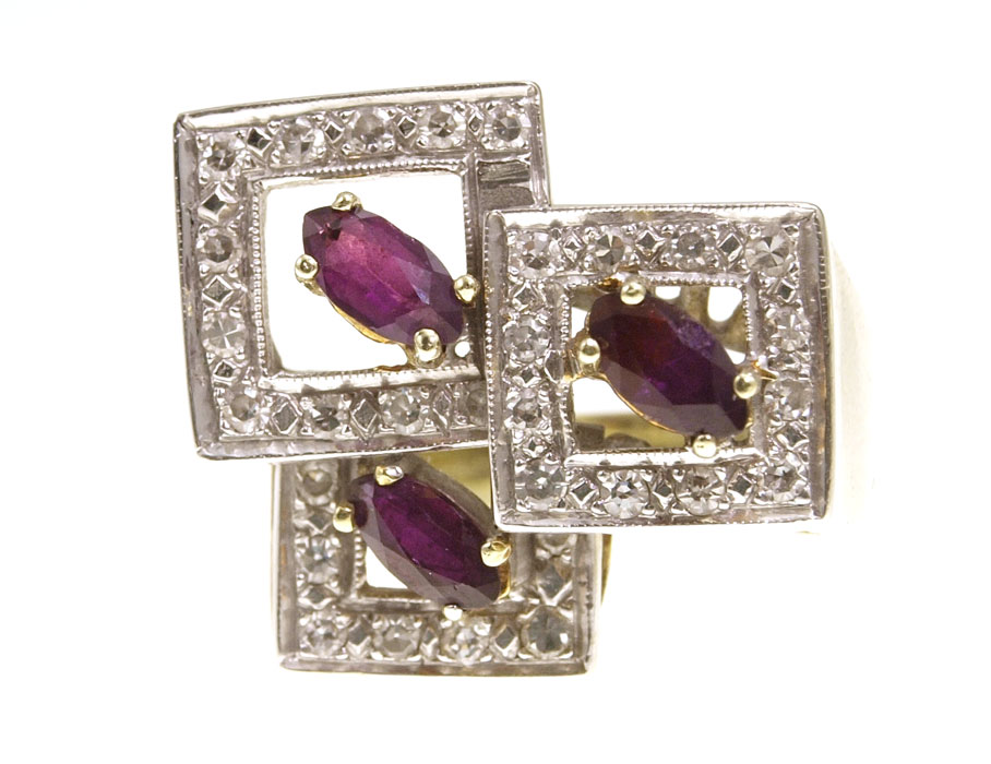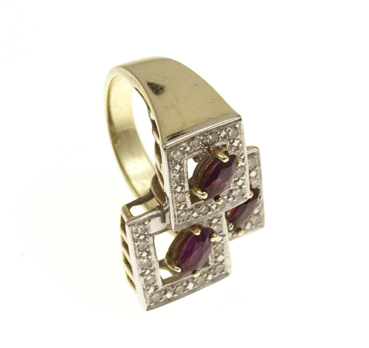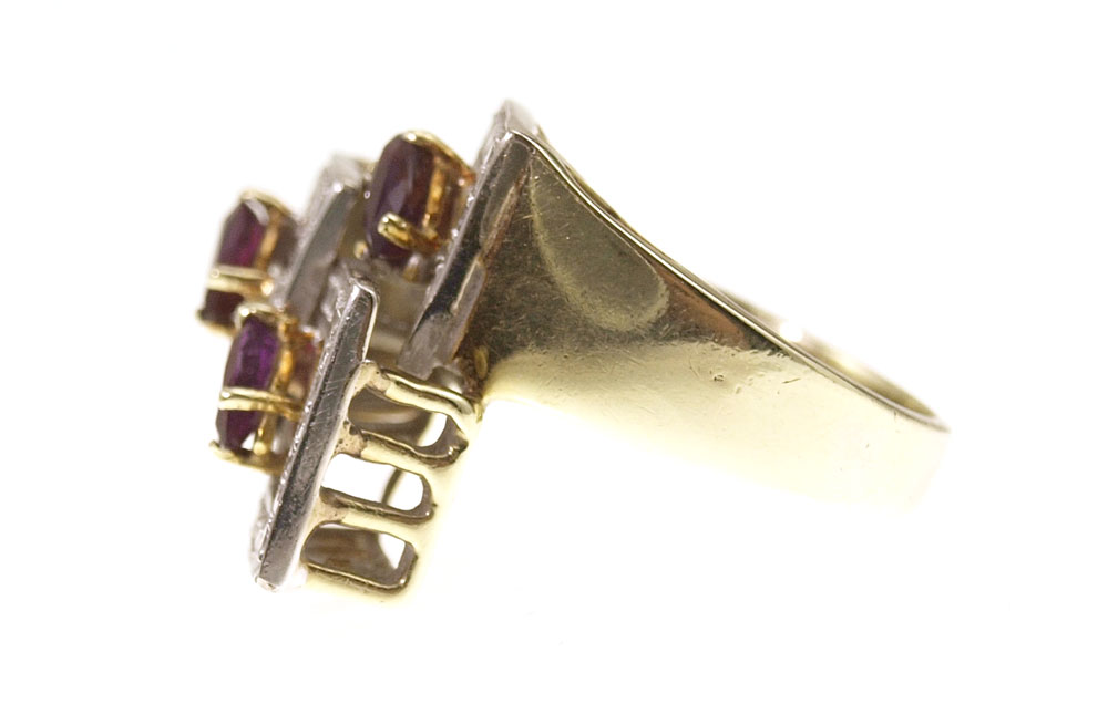 14K DIAMOND & RUBY RING: 14K yellow gold ring contains thirty round single cut diamonds. Weight: .50 Ct. Approx. The diamonds average VS-SI in clarity and H-I in color. Three marquise mixed cut rubies. Weight: .50 Ct. Approx. The diamonds and rubies are prong set. Weight: 12.6 grams. Size: 7 Est. $500/600**