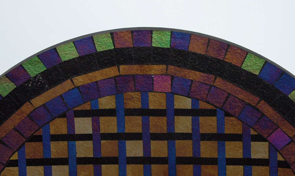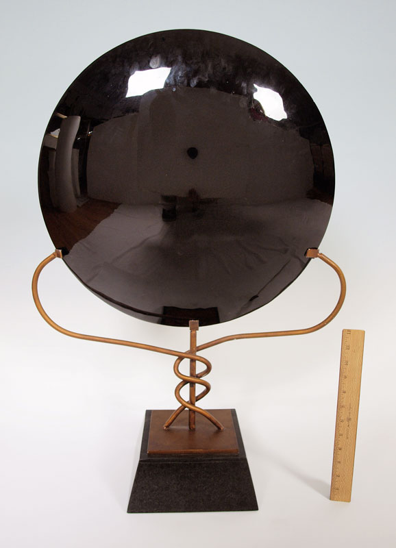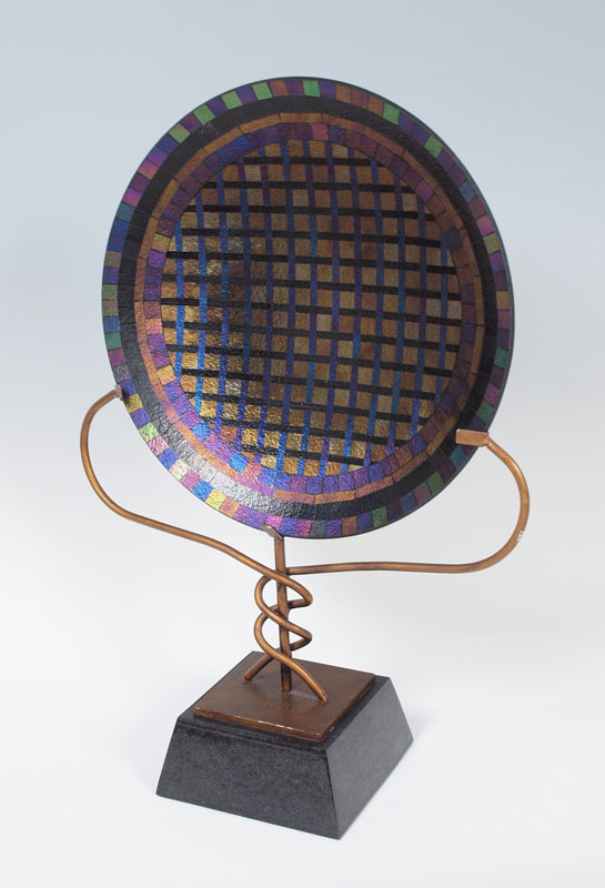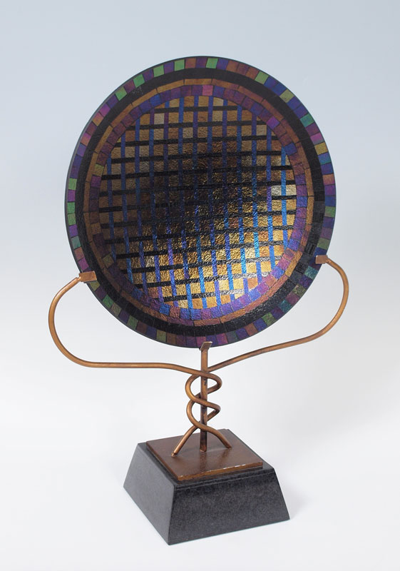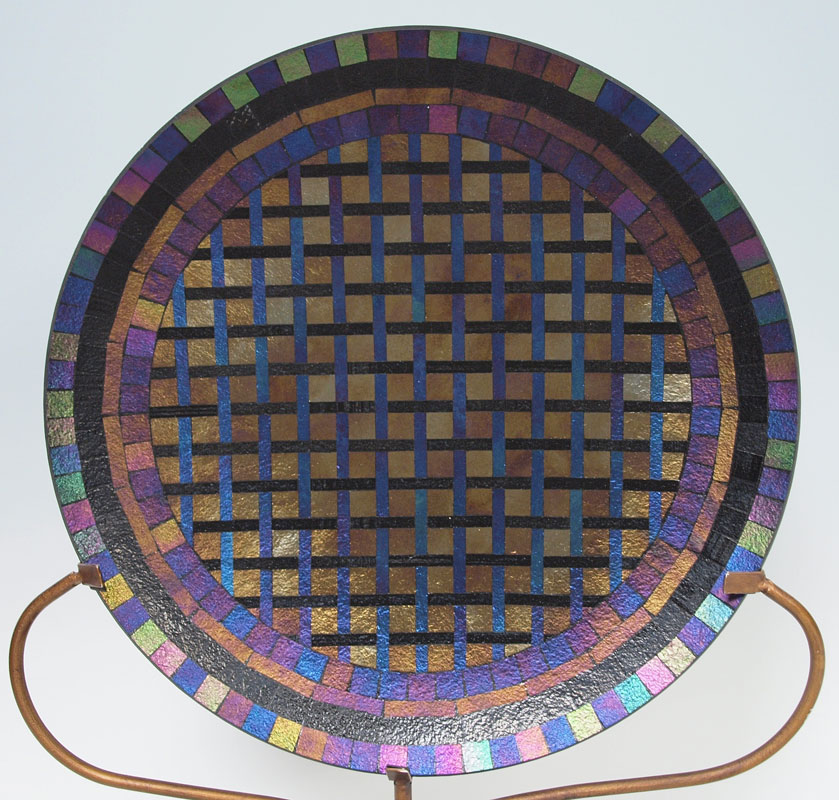 DICHROIC ART GLASS CHARGER ON STAND: Glass is 18 1/4'' dia., with the iron stand 21'' x 29''.