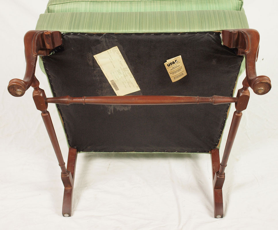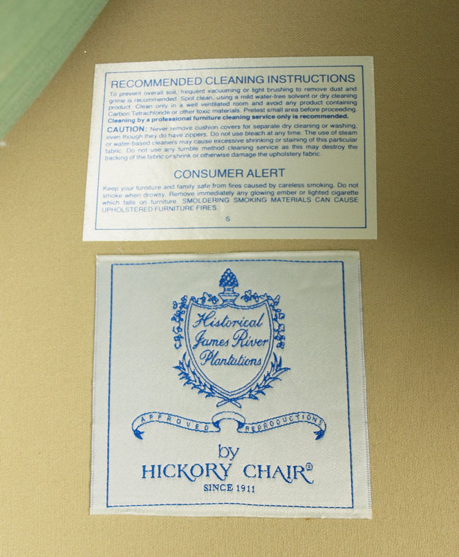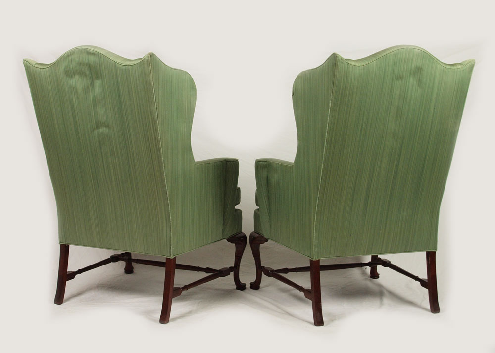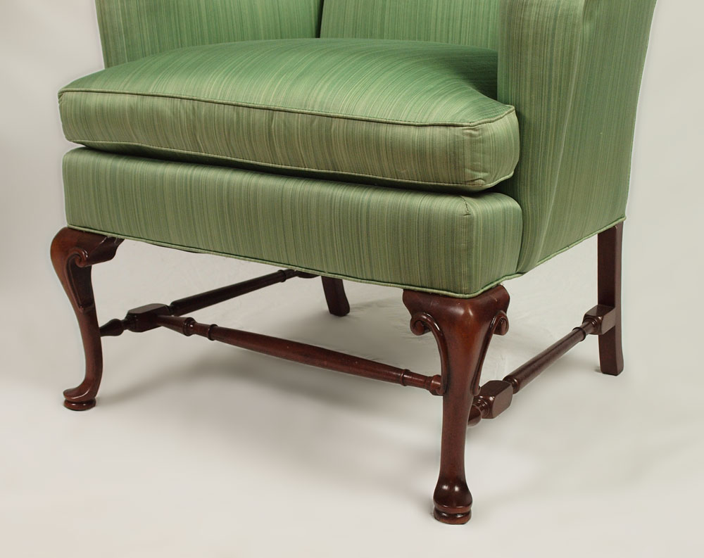 PAIR OF HICKORY CHAIR WING BACK CHAIRS: Queen Anne style chairs from the ''Historical James River Plantations Approved Reproductions by Hickory Chair'', cabriole front legs and pad feet, straight back legs, H stretcher, vibrant green upholstery, ''springdown'' cushions, 45''h. x 32'' x 29''.
