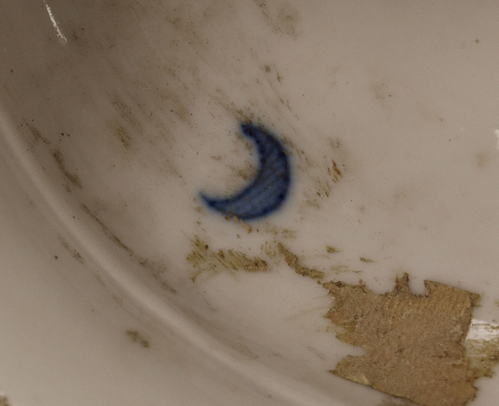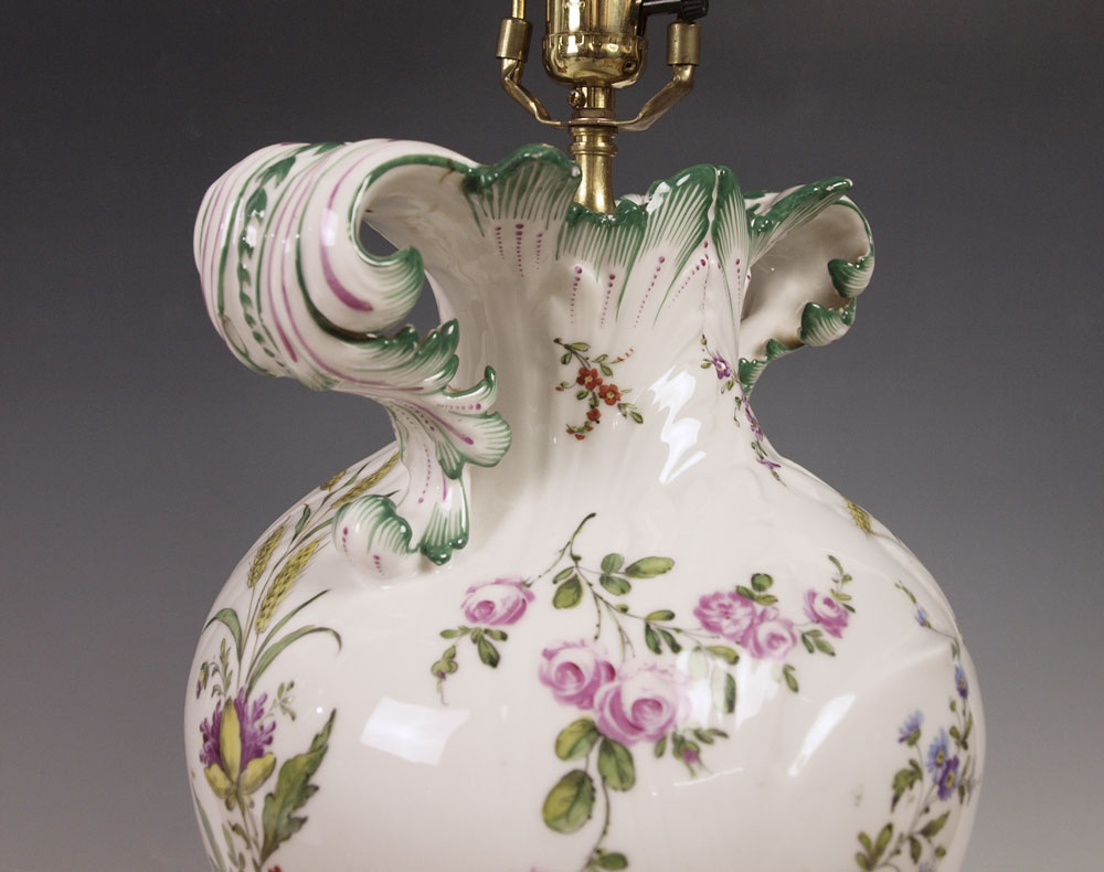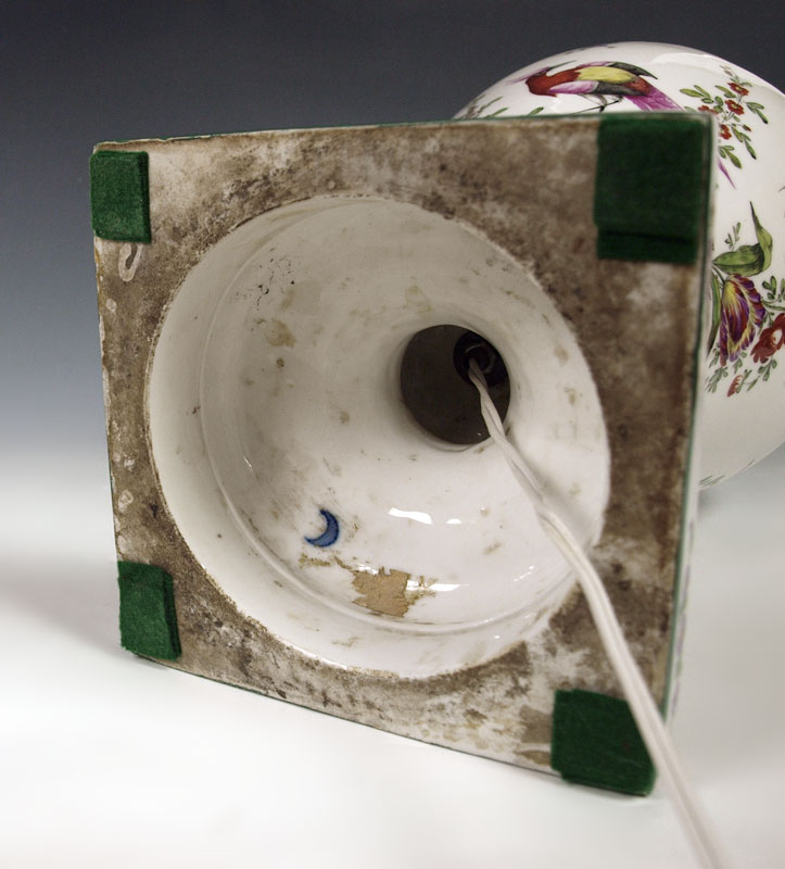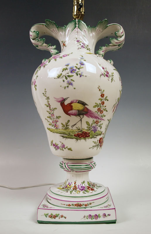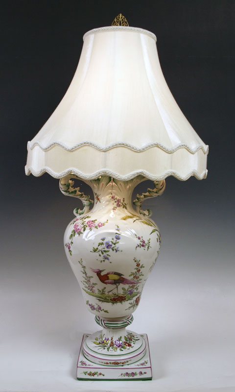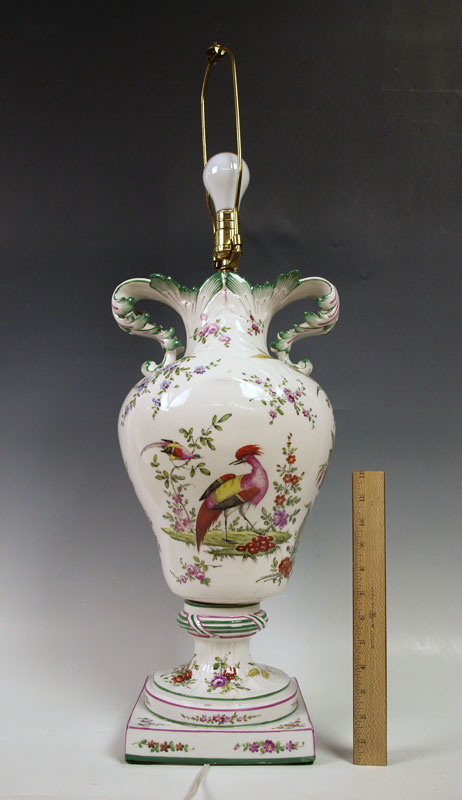 PAINT DECORATED FAIENCE LAMP: Blue crescent mark. Fresh white with floral and bird decoration, scrolled rim. Porcelain is 21'', lamp 35'' overall.