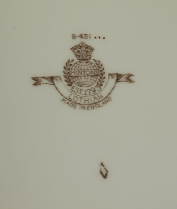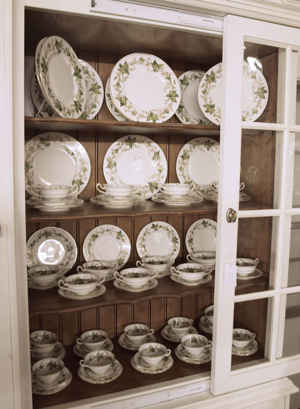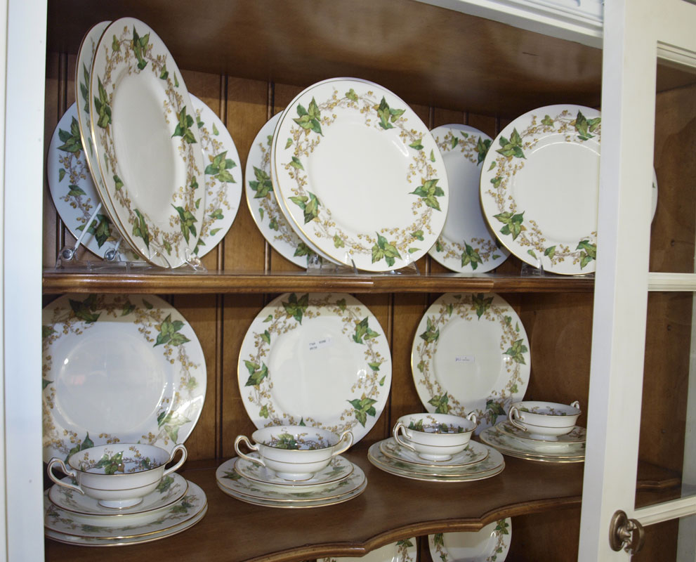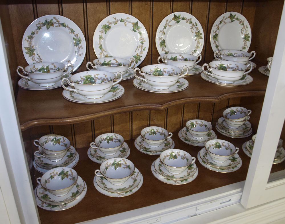 MINTON IVY LEAF ''LOTHIAN'' PATTERN CHINA SERVICE FOR 12: 84 pieces to include 12 each of dinner plates, salad plates, bread plates, cream soups with saucers, cups and saucers.
