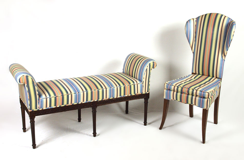 MAHOGANY 6 LEG BENCH SEAT AND DIMINUTIVE WING CHAIR: Two distinct styles in matching striped upholstery. Bench 28''h. x 54''w. x 17 1/2''. Chair 46''h. x 20 1/2'' x 21 1/2''.