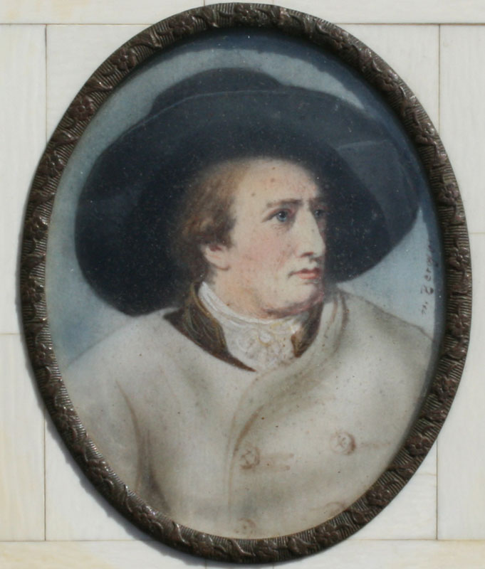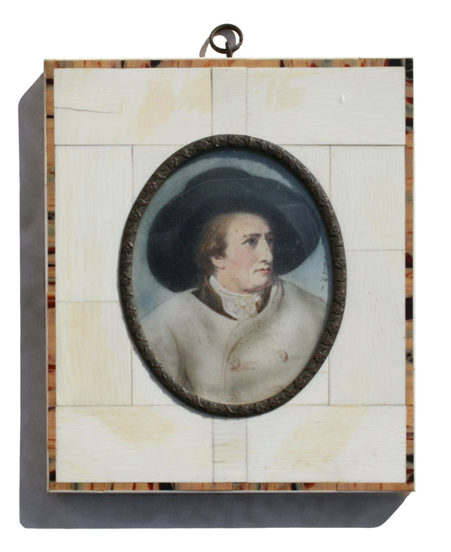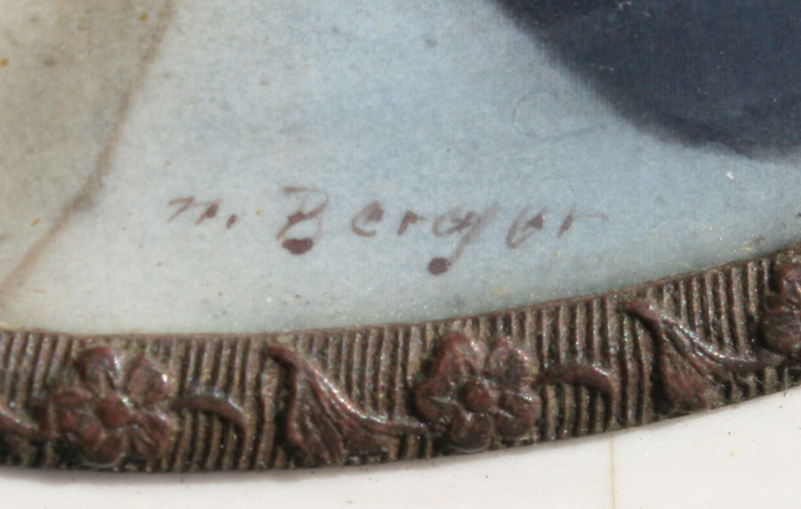 MINIATURE WATERCOLOR ON IVORY PORTRAIT OF A GENTLEMEN WEARING HAT: Signed M. Berger, 3'' x 2 1/2'', encased in piano key ivory frame, 5 1/2'' x 4 5/8''. Est. $300/500**