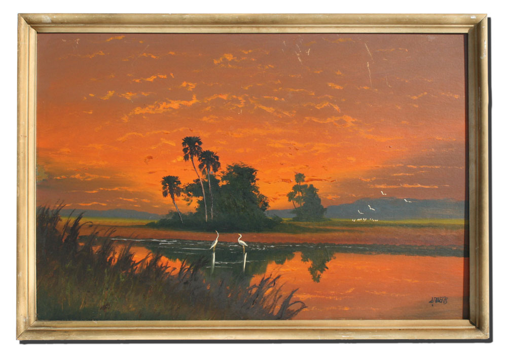ROBERTS, Livingston, (American, 20th Century): Florida Highwaymen Sunset Everglades Landscape with Herons, OIL/Upson, 24'' x 36'', signed, encased in original frame, 26'' x 38''. Est. $600/800** CONDITION: Several abrasions in the upper right corner.