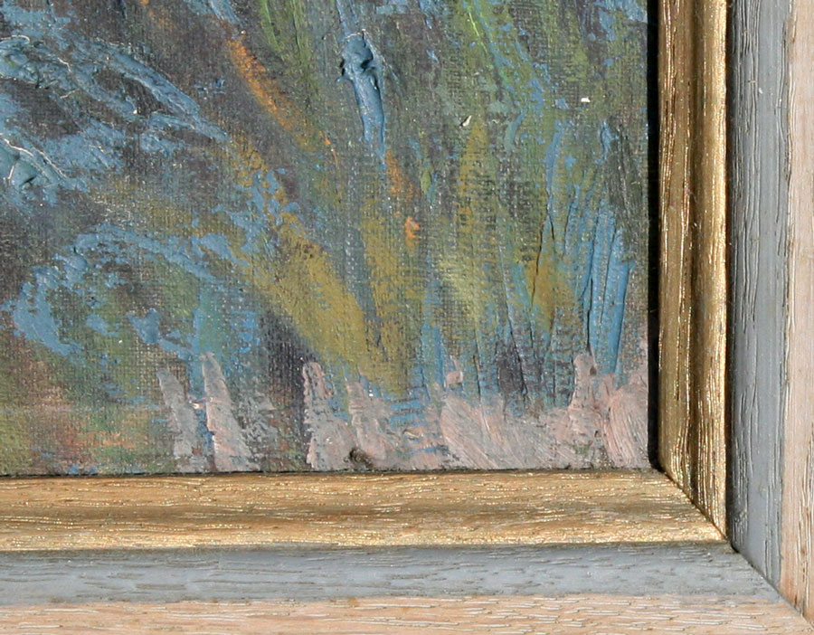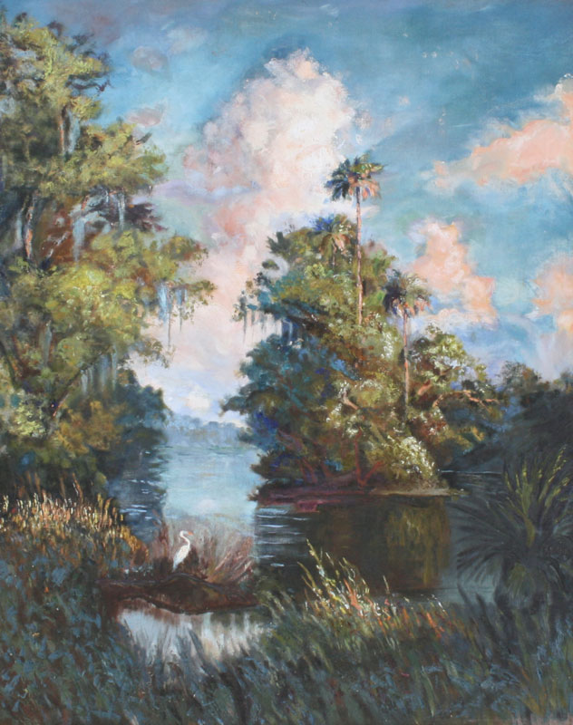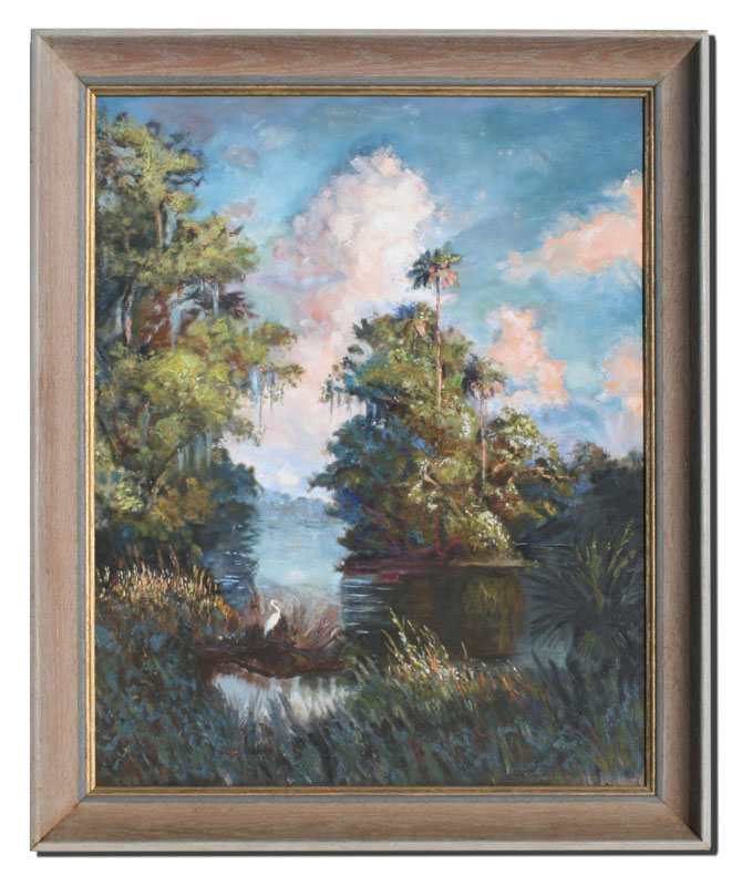 HIGHWAYMEN STYLE BACKWATERS FLORIDA WILDLIFE SCENE: Reminiscent of Newton, Bacchus, etc., OIL/Canvas, 30'' x 24'', white washed oak frame 35'' x 28 1/2'', illegible signature lower right. Est. $300/500**