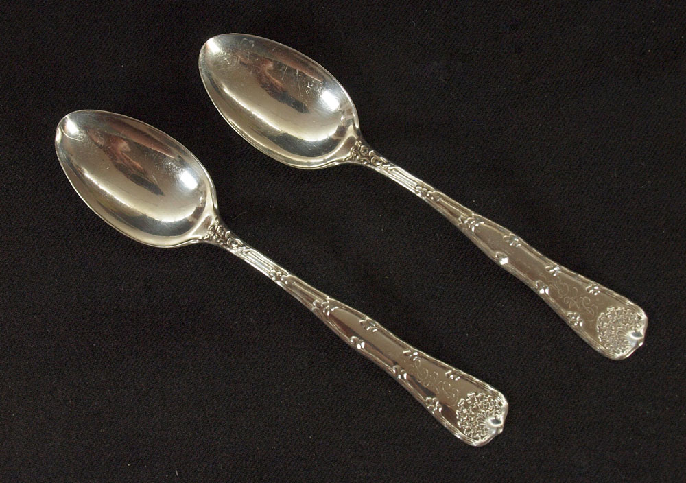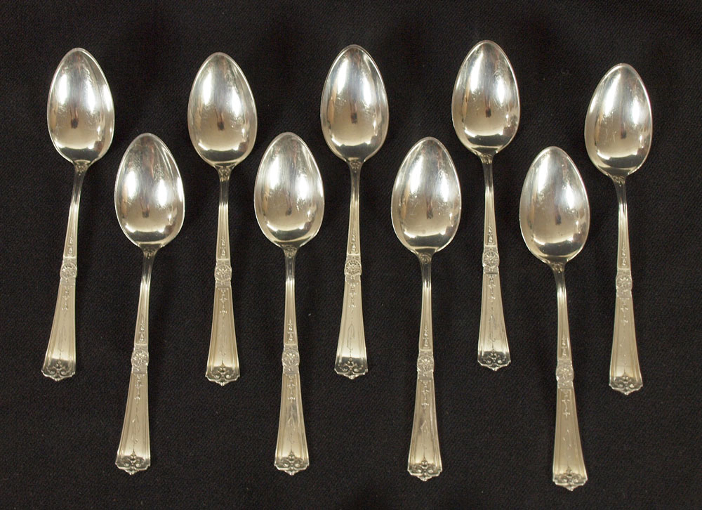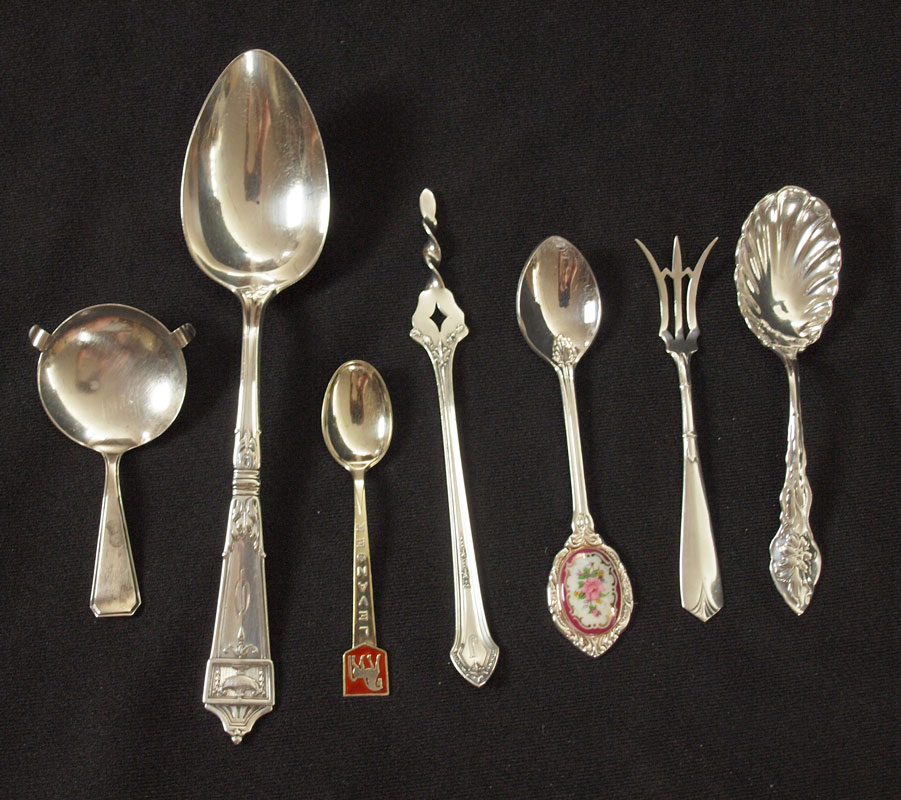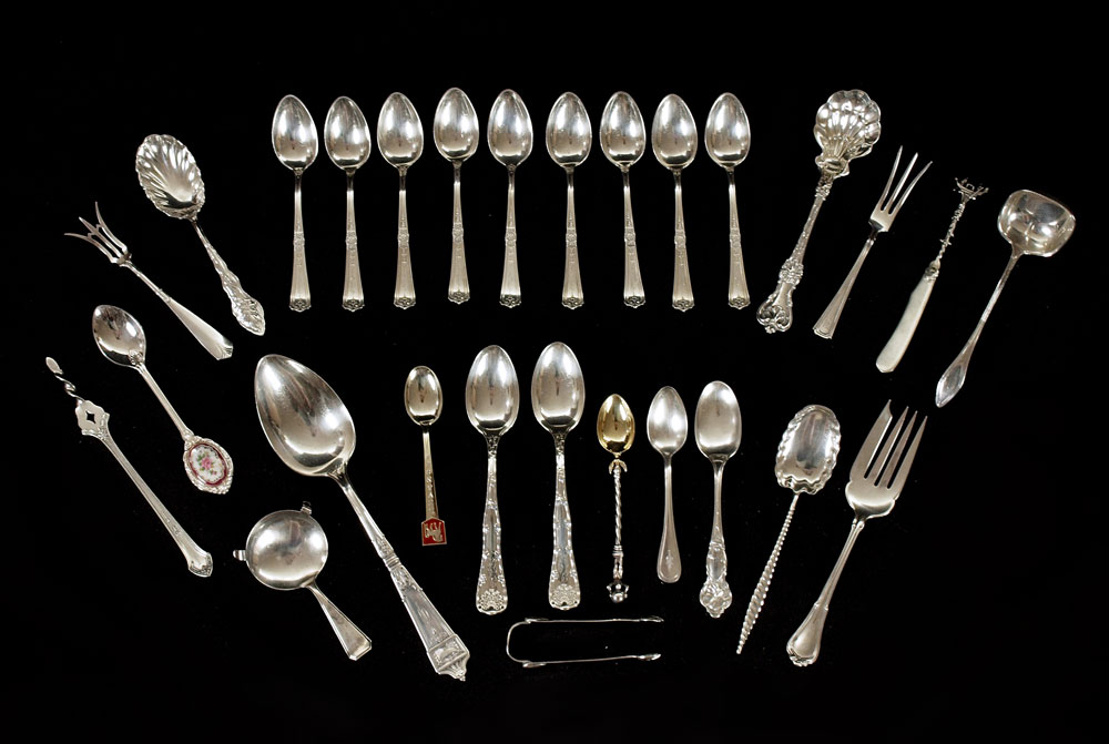 28 PIECE ESTATE STERLING FLATWARE: Approx. 28 piece, highlights to include 2 Tiffany & Co. teaspoons, Durgin, Wallace, English silver figural and much more. Broken Tiffany spoon included with lot. Approx. 18.7 troy oz.