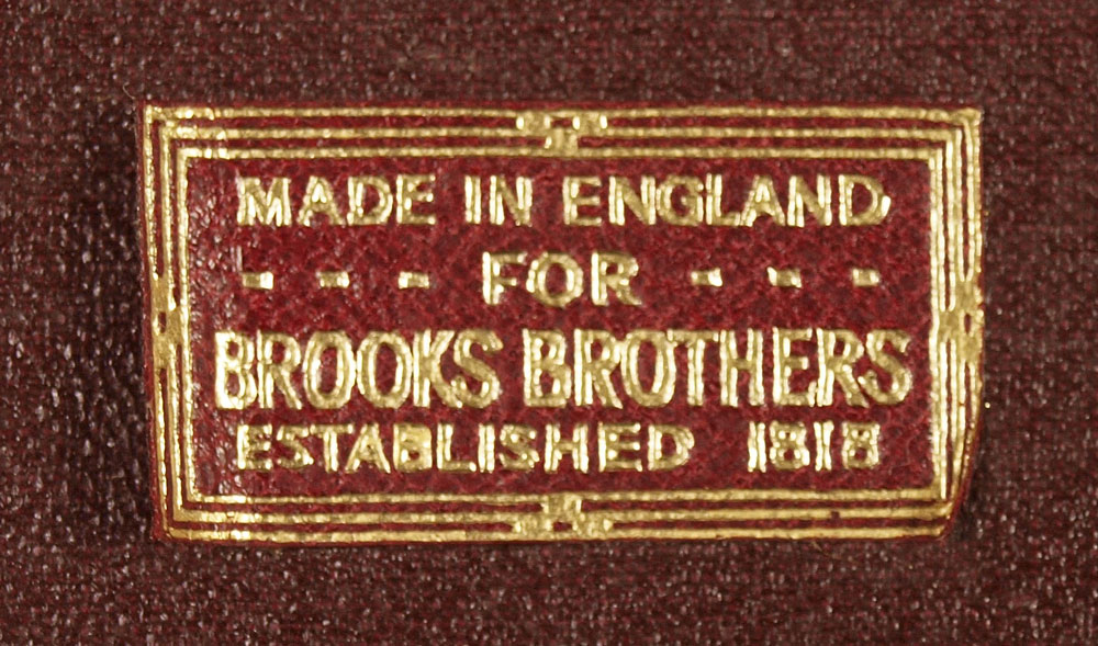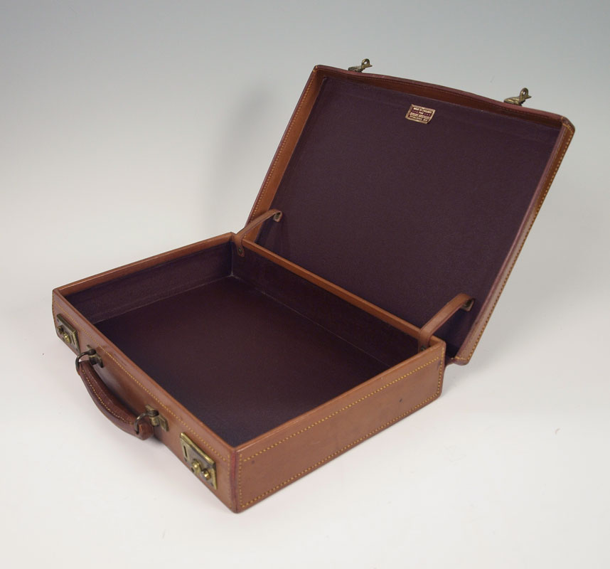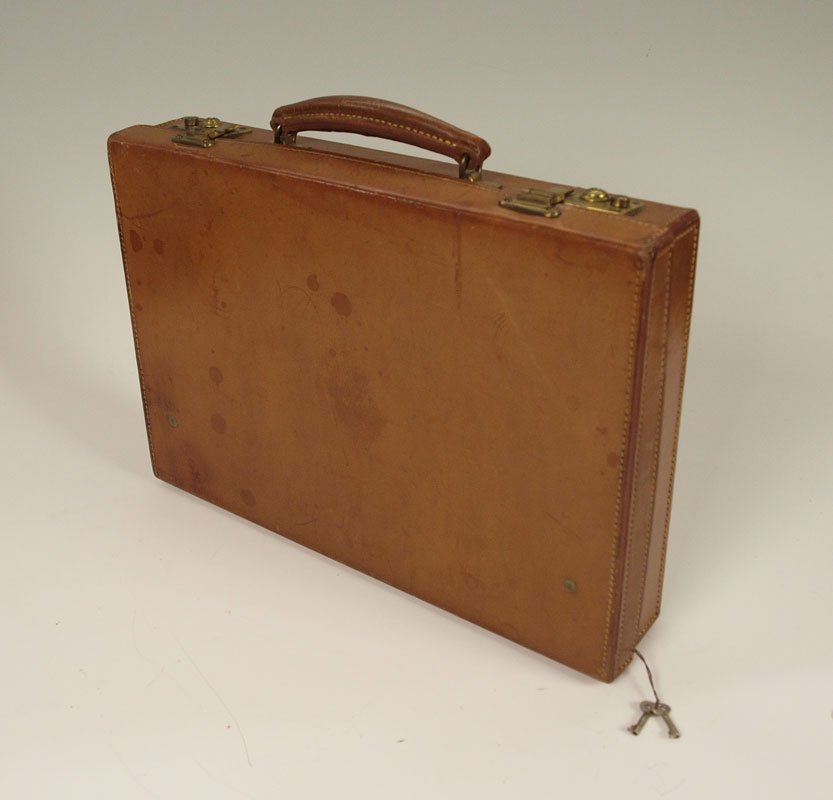 BROOKS BROTHERS LEATHER CITY ATTACHE CASE: Natural tan leather with brass fittings. Made in England especially for Brooks Brothers. Has 2 keys. 12 1/4'' x 16 1/4'' x 3''.