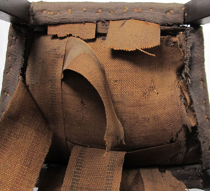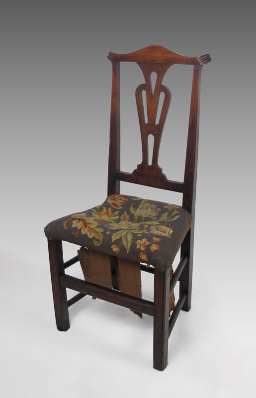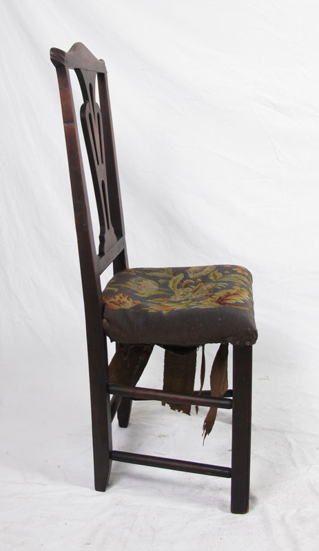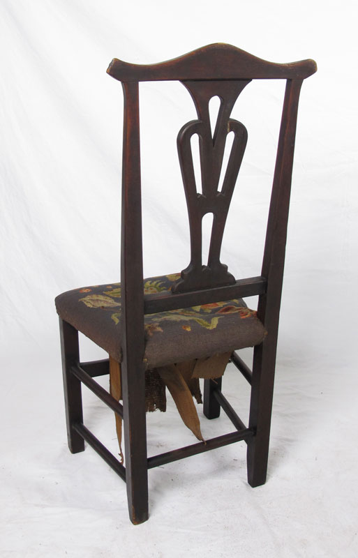 PERIOD COUNTRY CHIPPENDALE SIDE CHAIR: Fine old patina. Batwing crest over open cut back slat. Pegged straight leg construction. Old needlepoint covered seat. Approx. 42'' tall x 19'' wide x 16'' deep.