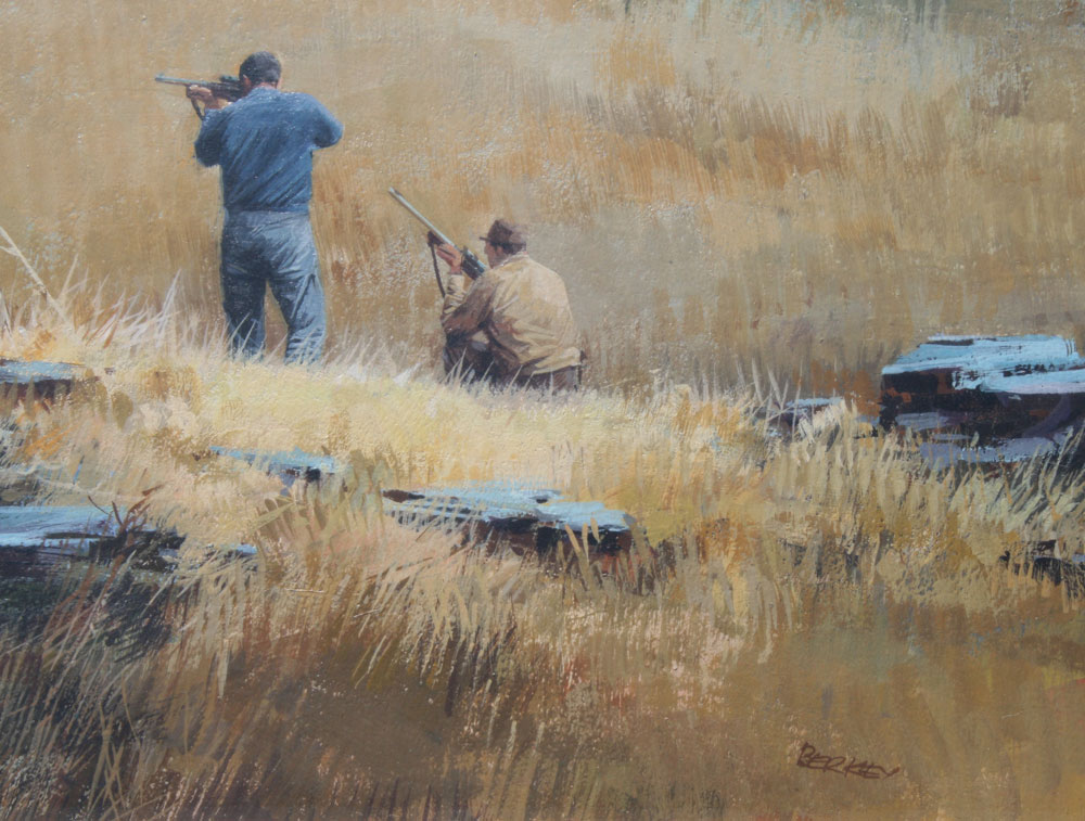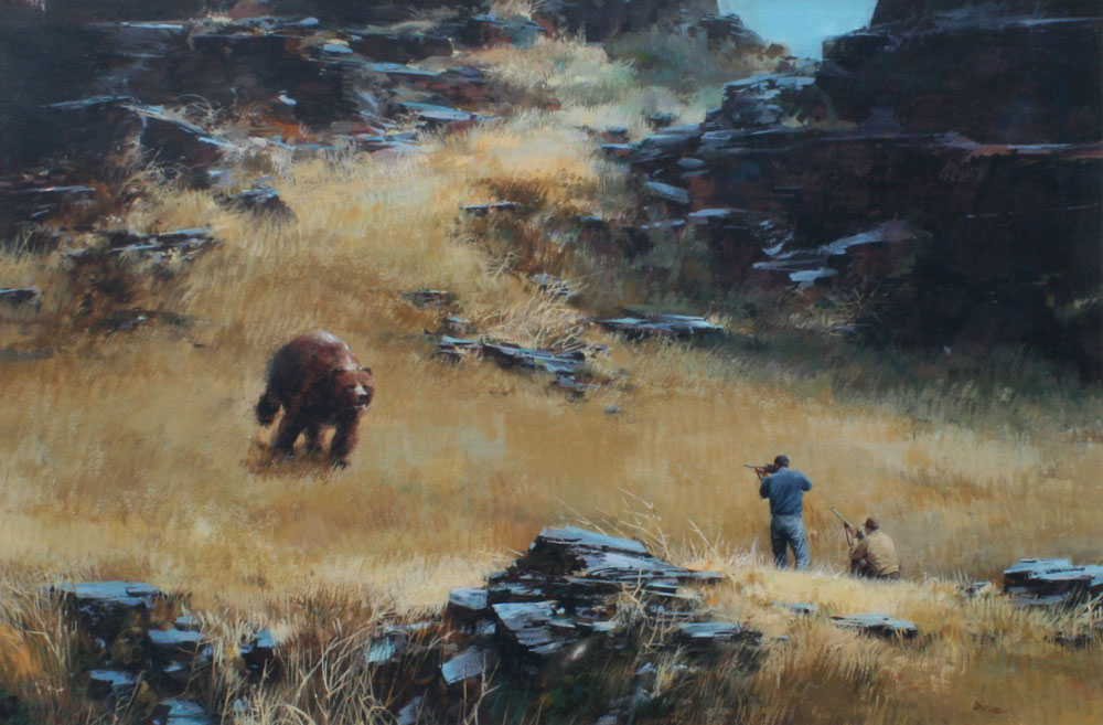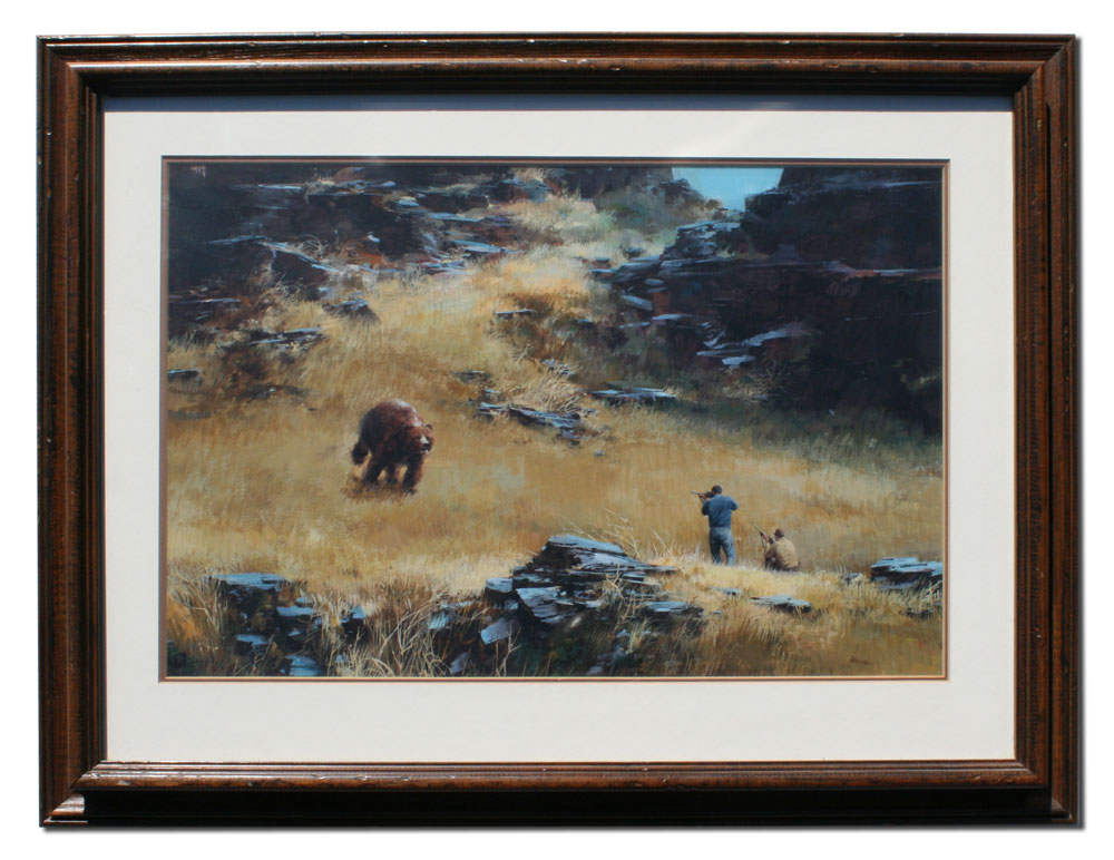 BERKEY, John Conrad, (American, 1932-2008): Grizzly Charge, OIL/Board, sight size 14 1/4'' x 21 3/4'', signed lower right, encased in wood frame, 22 1/2'' x 30''.
