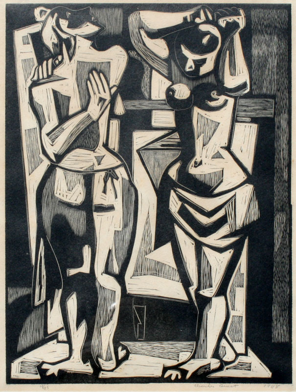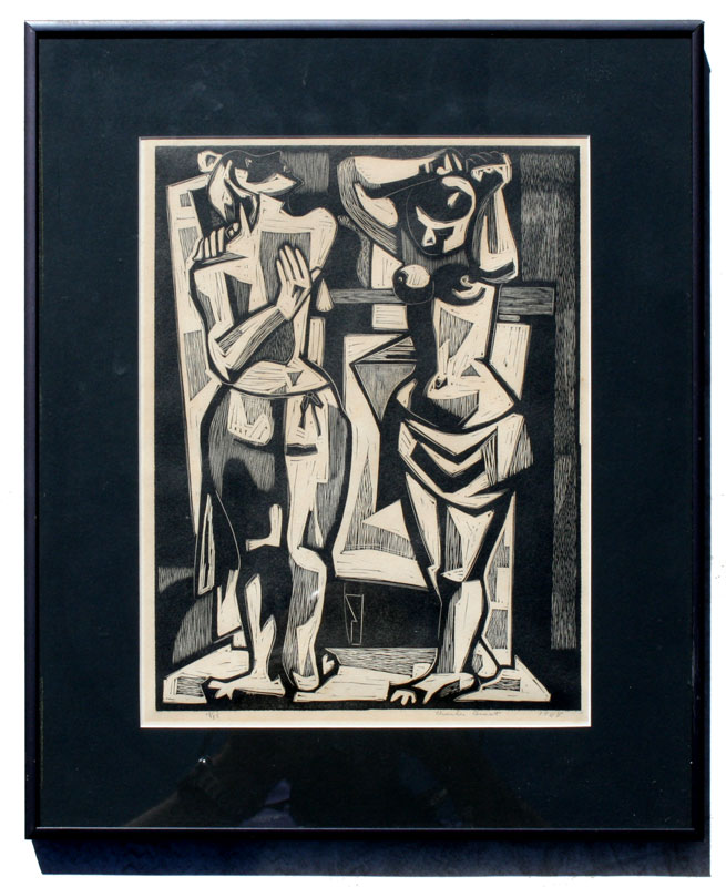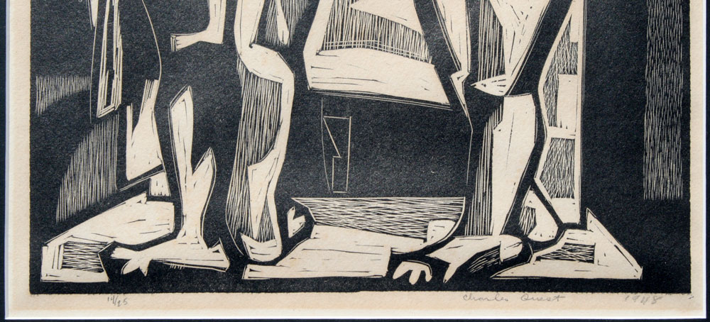 QUEST, Charles Francis, (American, 1904-1993): Nude Female Bathers, Woodcut, sight size 12 1/4'' x 9 1/4'', pencil signed lower right, dated 1948, numbered 14/25, encased in black metal frame, 17 1/4'' x 14 1/4''. Est. $400/600**