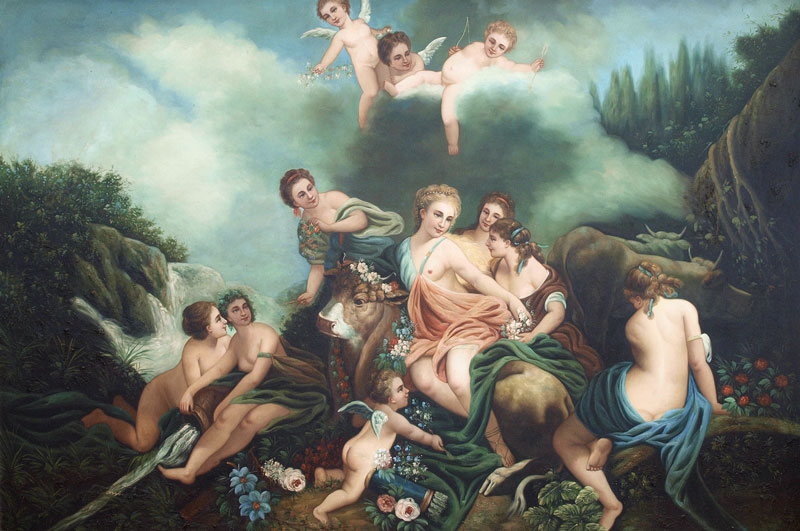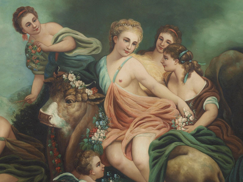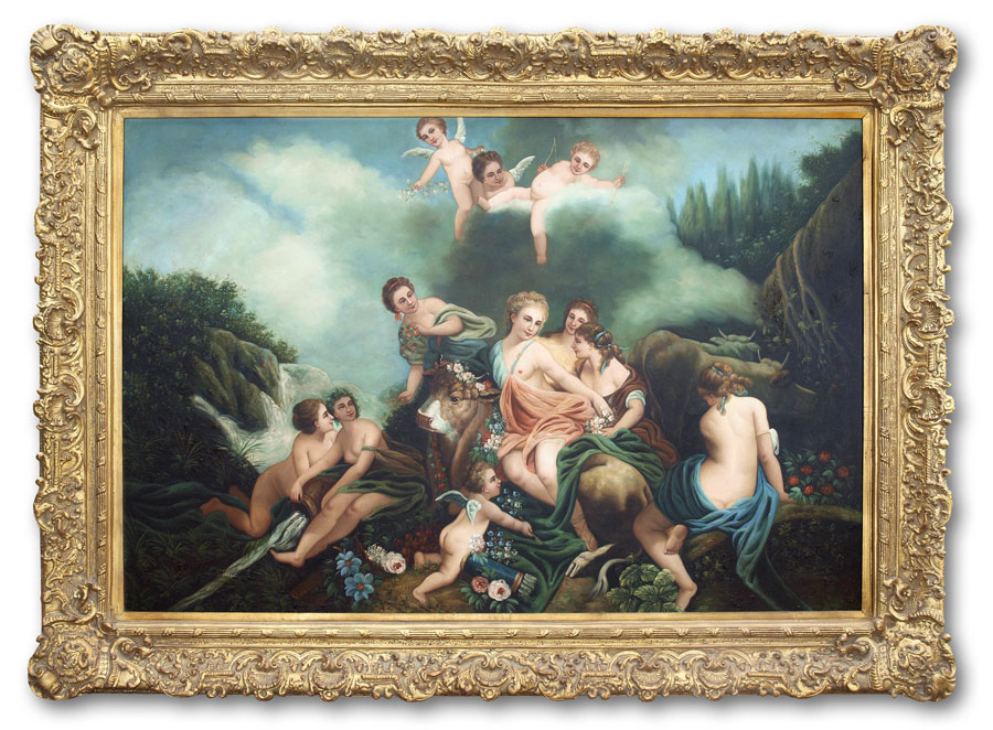 HUGE CONTEMPORARY O/C: Scene depicts ''The Rape of Europa'' after the artist François Boucher. Europa was the daughter of the King of Sidon who fell for Zeus' wooings. The piece is extraordinarily large and the ornate frame is wide and thick. Illegibly signed Farrington? 5'h X 81''w with frame. Est. $400/600**