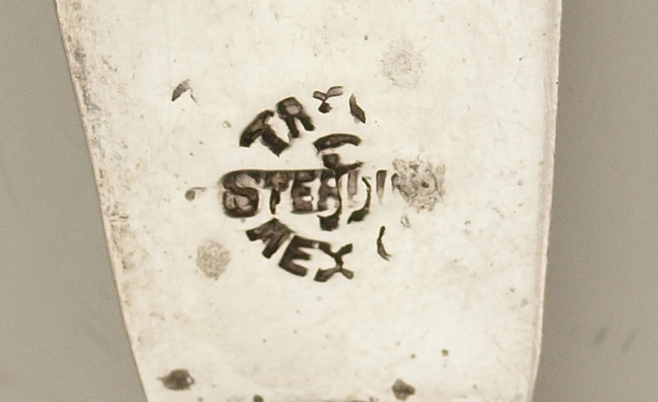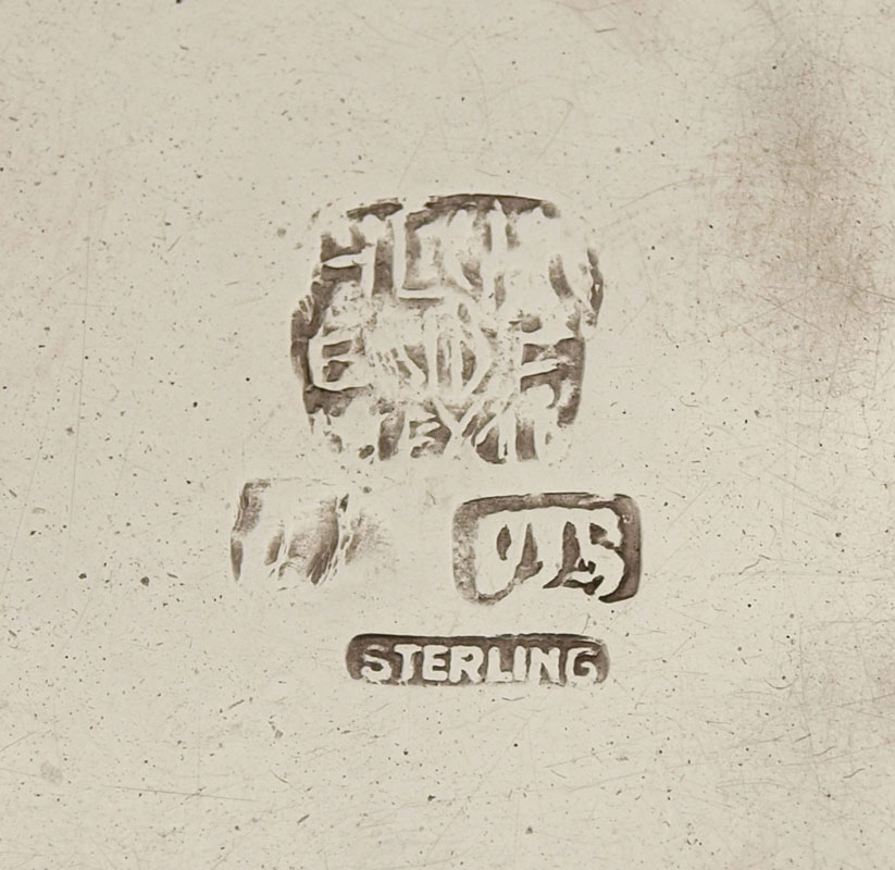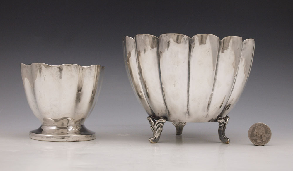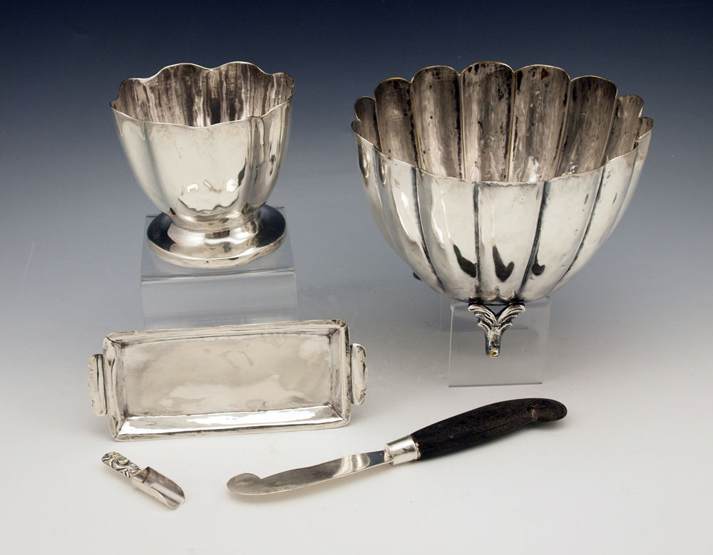 5 PIECE MEXICAN SILVER COLLECTION: To include 1) Illegible footed bowl ''Plattado? Silver'' with scalloped sides, 4 1/2'' h. x 6''. 2) Prieto Juarez 930 silver bowl, 3 1/8'' h. x 3 5/8'' dia. 3) Taxco Sterling knife blade with wood handle, 6 7/8'' l. 4) Unknown maker J.E., face powder scoop with small inset stone on handle, 2'' l.. 5) Illegible hallmarks small tray, this piece may not be Mexican, marked tray, 5 1/2'' x 2 1/4''. Approx. 14.2 troy oz.