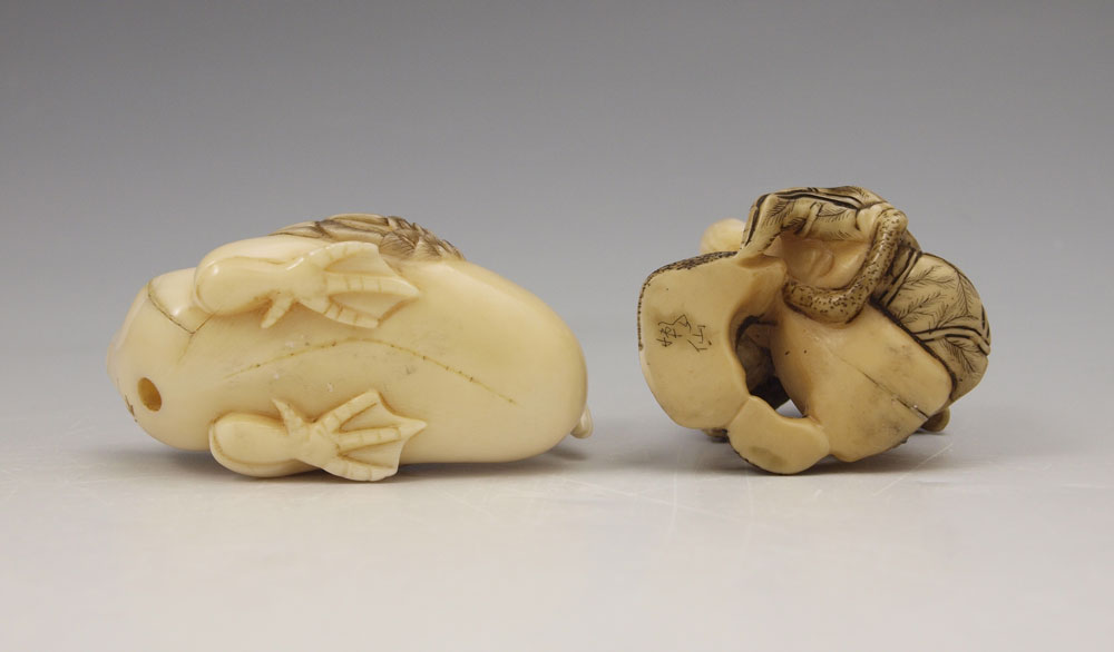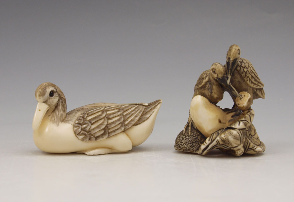 2 PIECE CARVED IVORY CRANES NETSUKE: To include 1) Seated crane, signed, 1'' h. 2) Pair of cranes on rocks, signed, 1 3/4''.