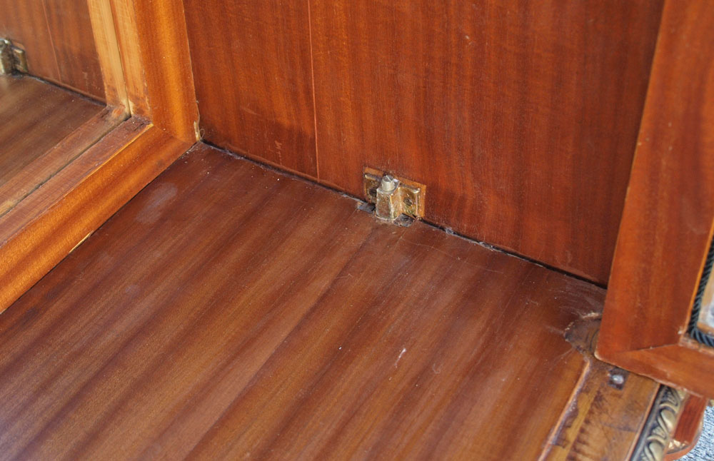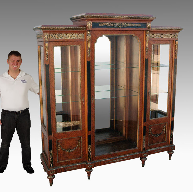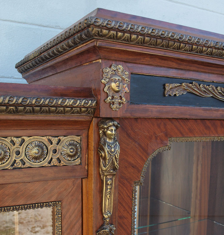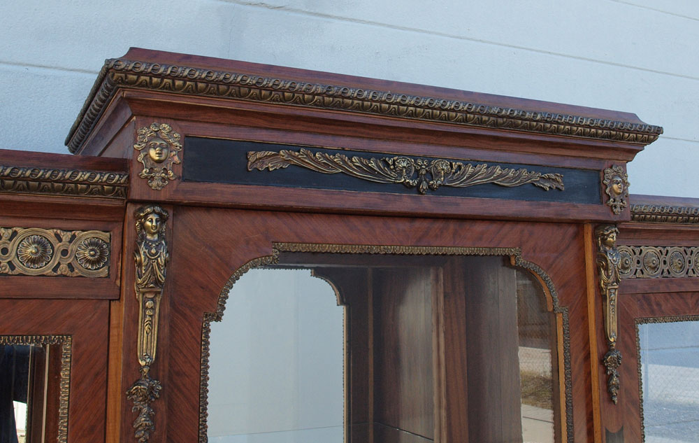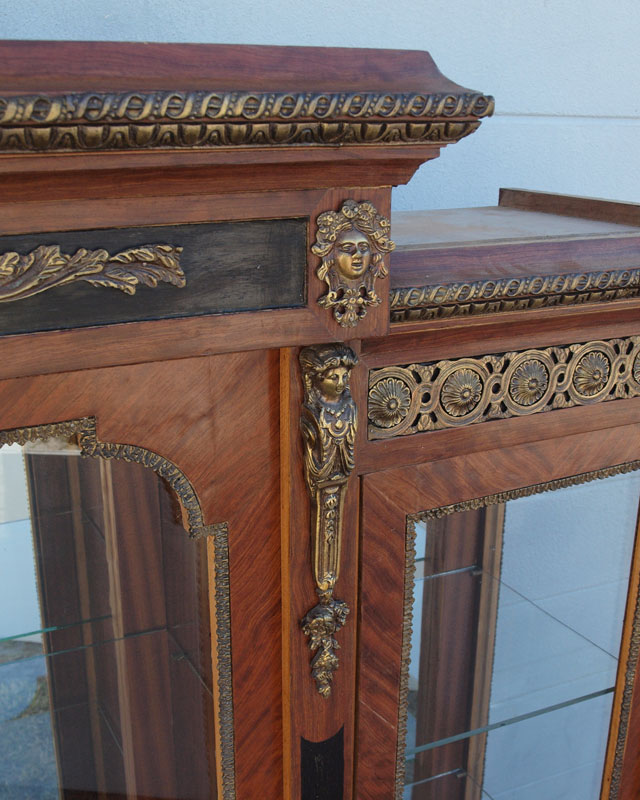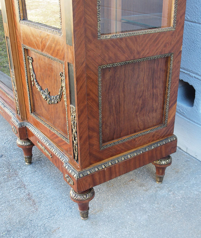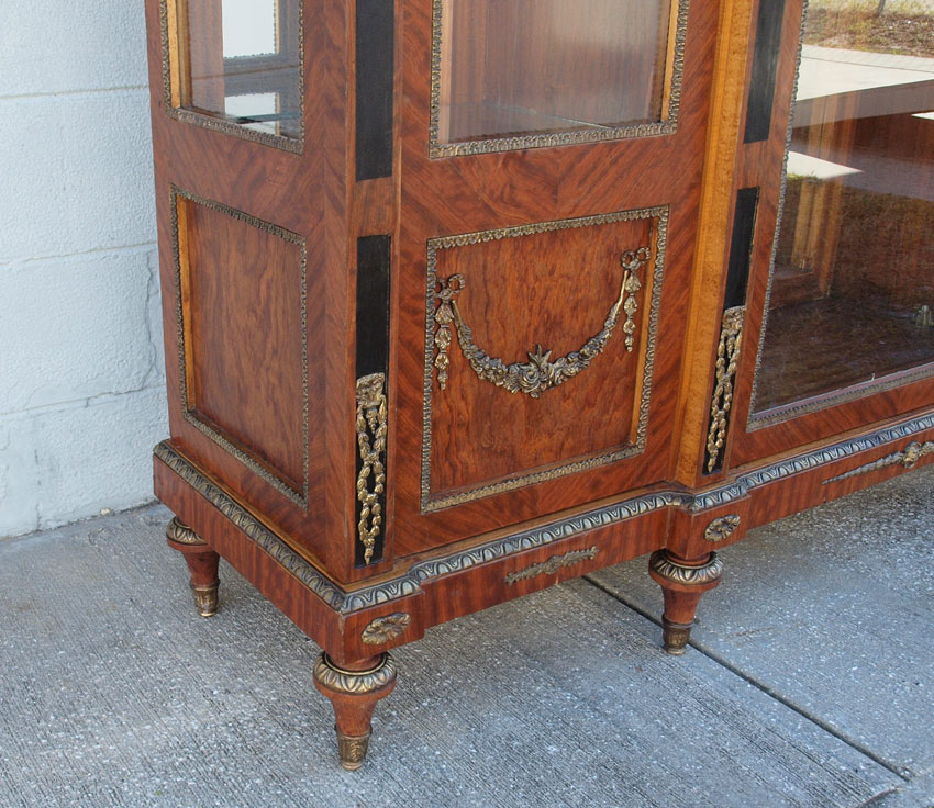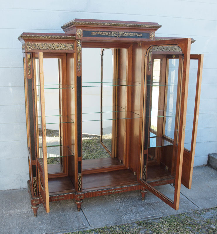 FRENCH ORMOLU TRIPLE FRONT DISPLAY CABINET: Louis XVI style. Mirror back interior with glass shelves. Approx. 74'' x 68'' x 19 1/2''