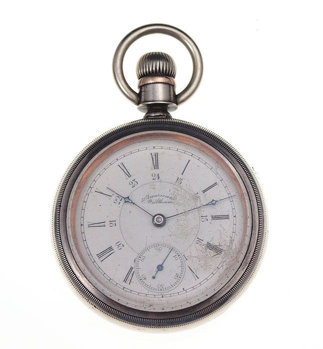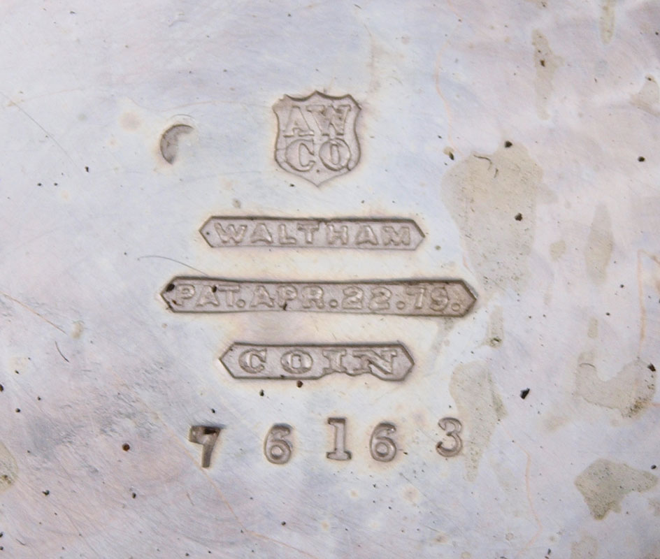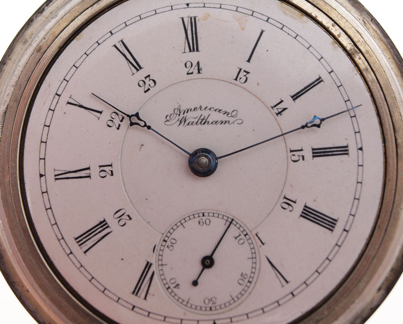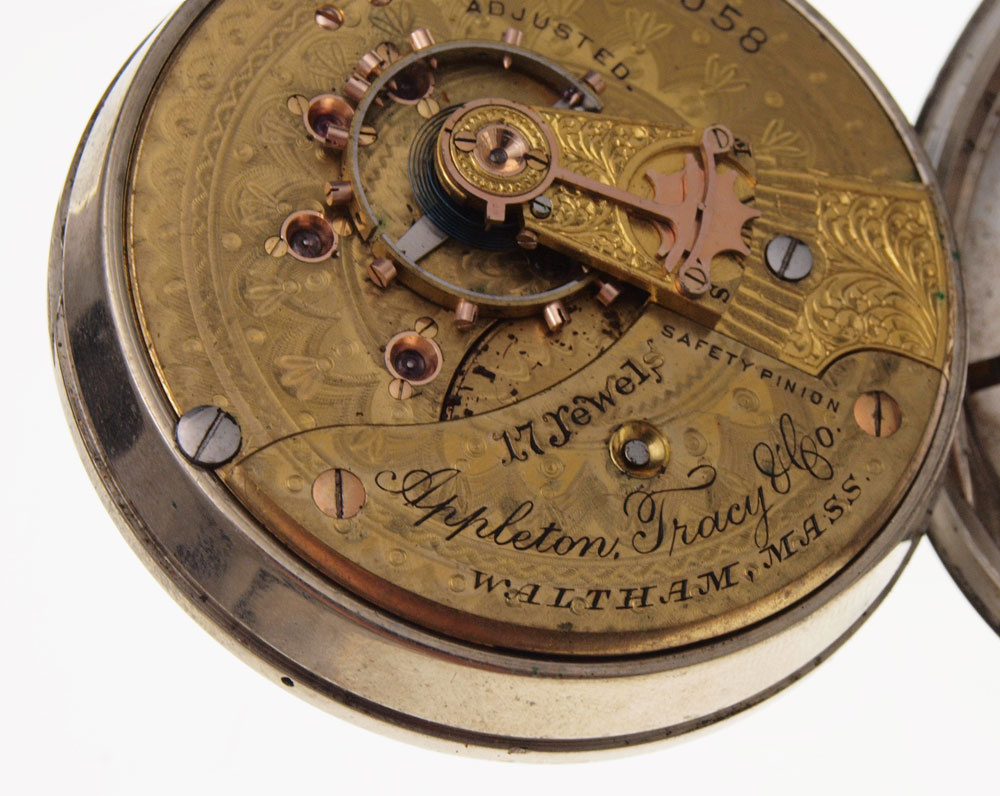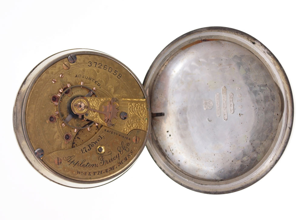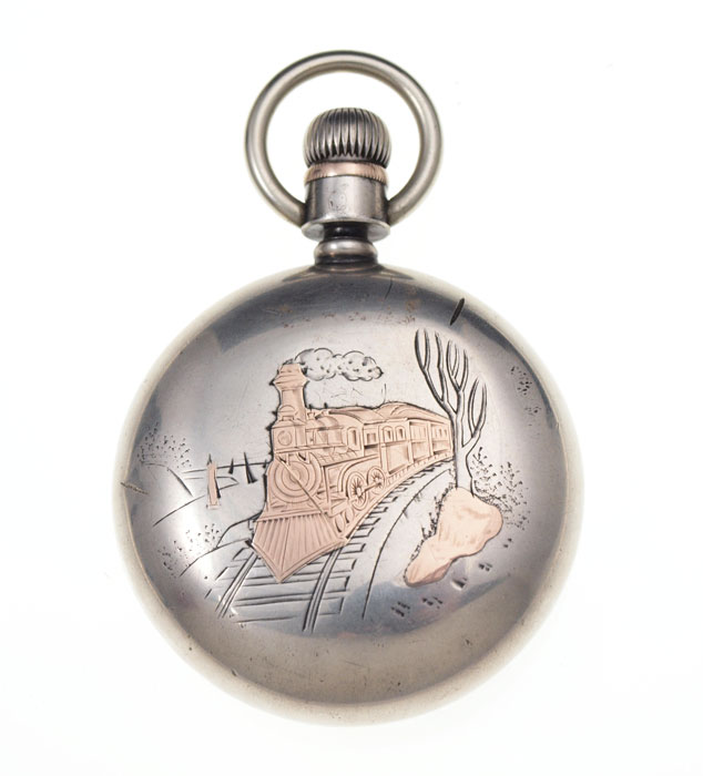 AMERICAN WALTHAM POCKET WATCH CA. 1887: Size 18 two tone coin silver case with engraved image of a train (scratched). Gilt movement with Appleton Tracy logo. Not in running order. The staff is broken.