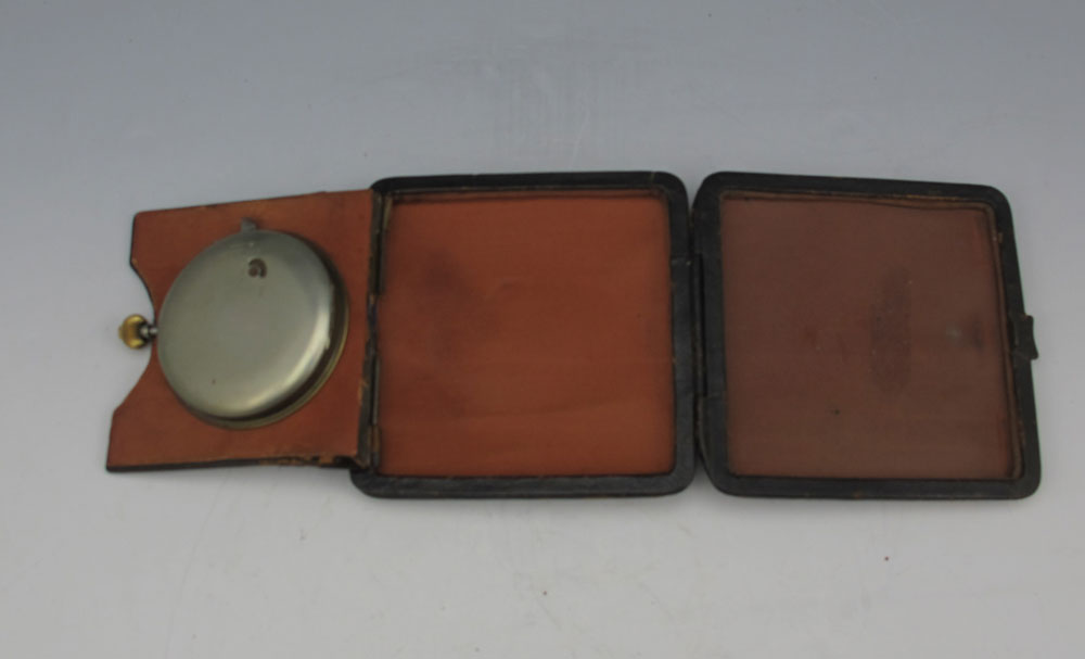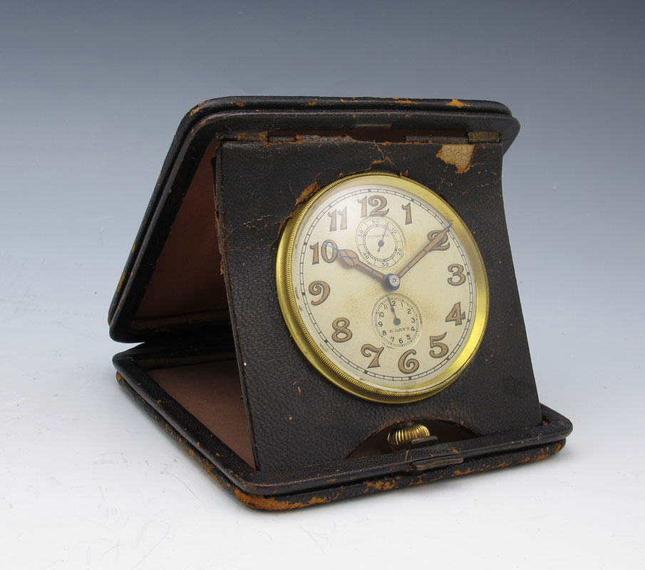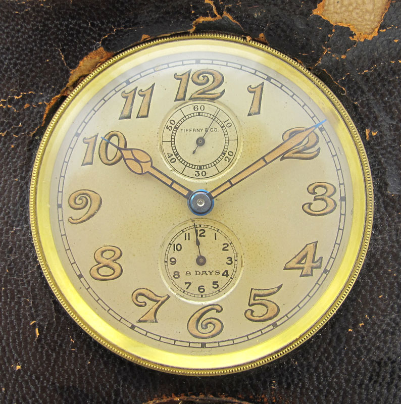 TIFFANY & CO. 8 DAY TRAVEL ALARM CLOCK: 8 day movement with secondary second and alarm time hands. Marked Tiffany & Co. on face, Sterling Silver on back cover. Leather case. 1'' h. x 4 1/8'' square. Est. $200/250**